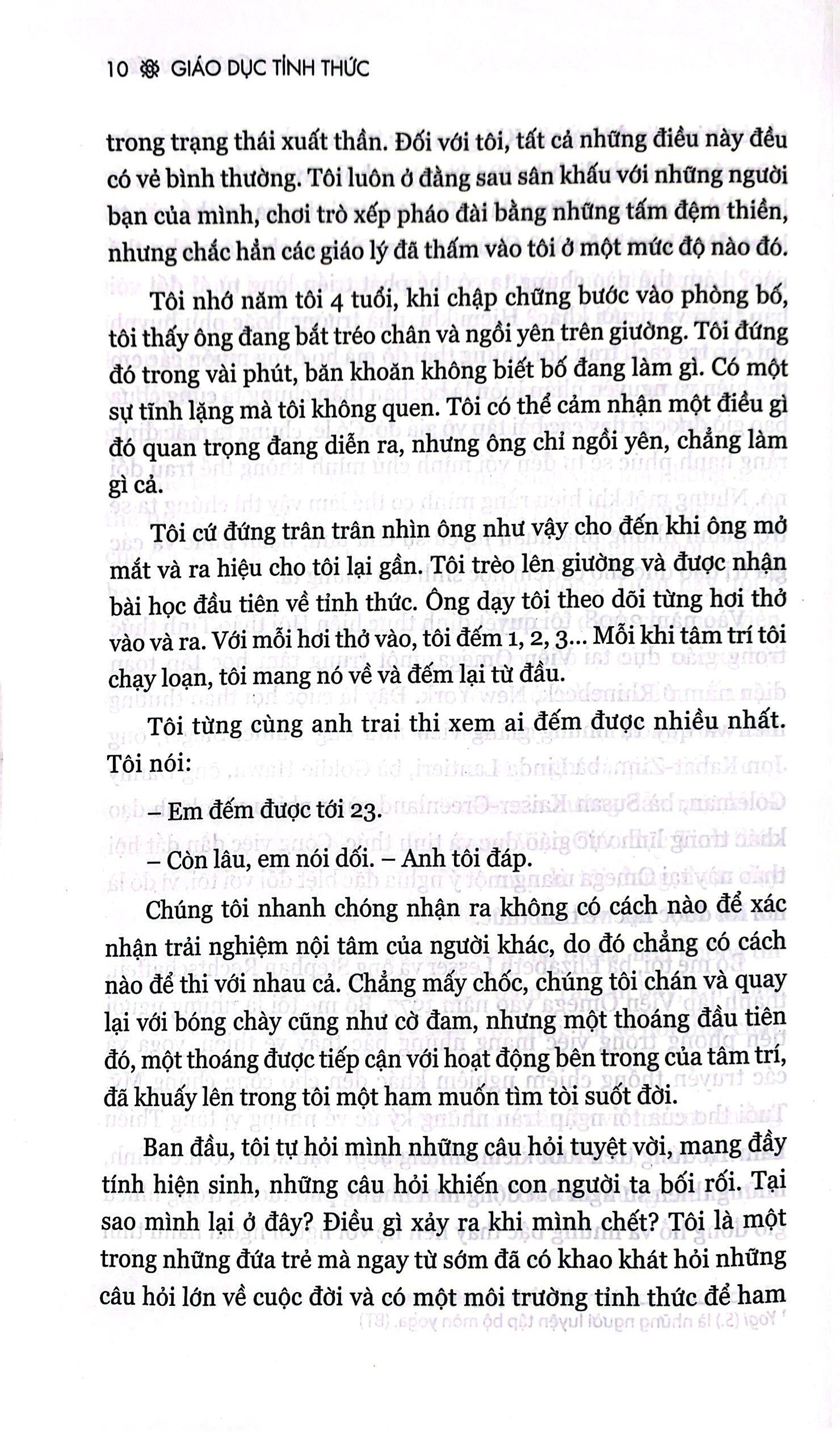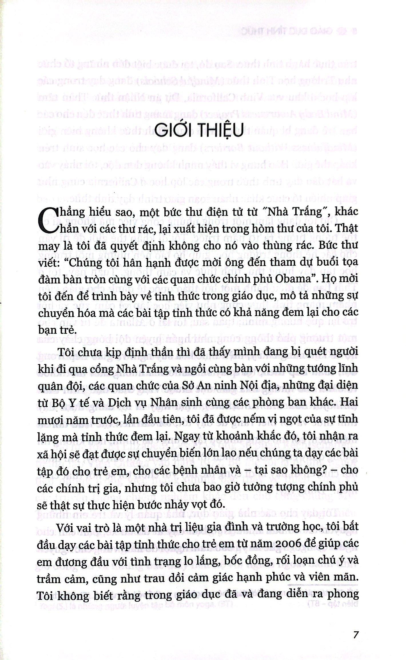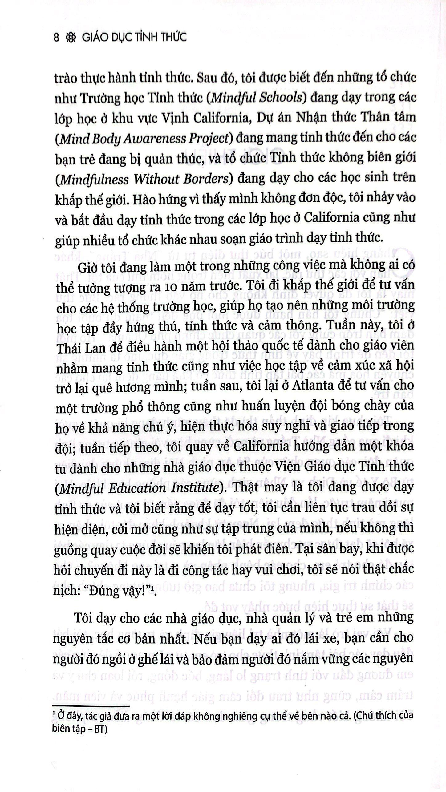 Giáo Dục Tỉnh Thức là một hướng dẫn thiết thực để nuôi dưỡng sự chú tâm, lòng trắc ẩn và hạnh phúc không chỉ ở những học sinh này mà còn ở chính giáo viên. Cuốn sách này đưa ra những ứng dụng thực tế của thực hành tỉnh thức trong chương trình giáo dục phổ thông bằng các giáo án, bài tập và các hoạt động phù hợp với nhóm tuổi cụ thể và học sinh có nhu cầu đặc biệt. Cuốn sách này mời các giáo viên, nhà quản lý và bất kỳ ai quan tâm đến giáo dục tận dụng những giá trị của tỉnh thức và trở thành những nhà giáo dục tỉnh thức và nhân á