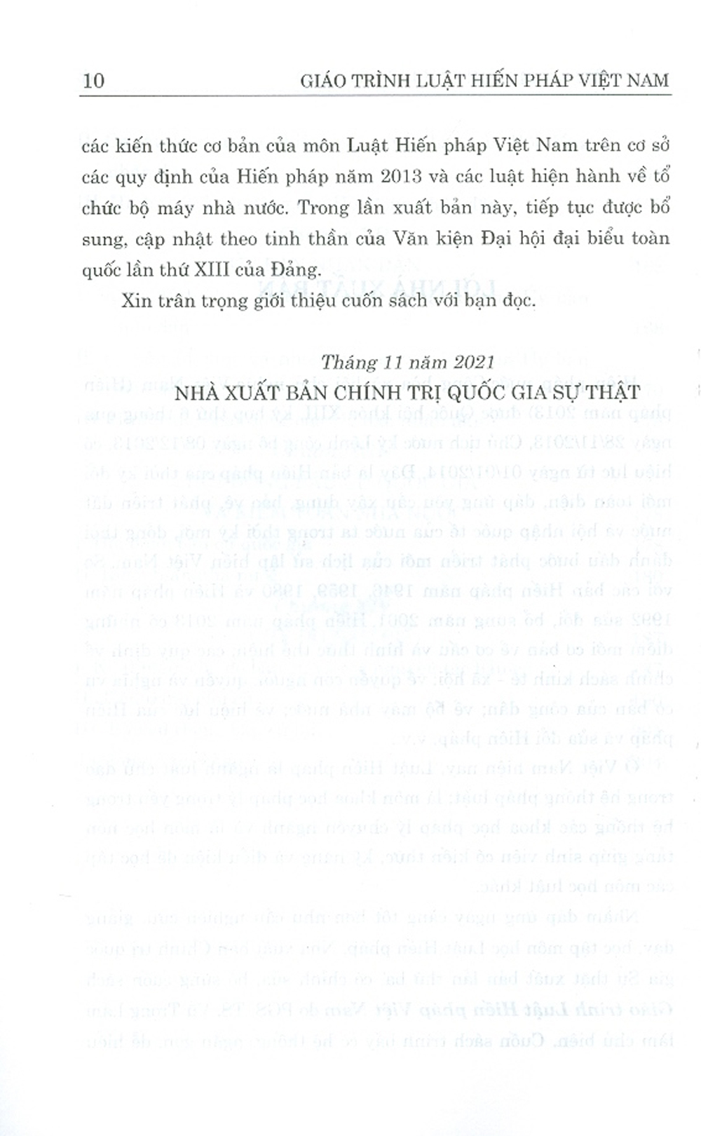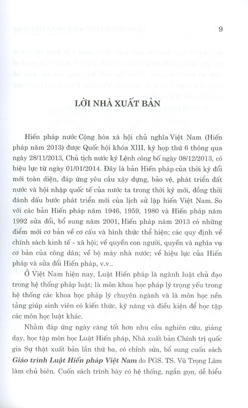 Nhằm đáp ứng ngày càng tốt hơn nhu cầu nghiên cứu, giảng dạy, học tập môn học Luật Hiến pháp, Nhà xuất bản Chính trị quốc gia Sự thật xuất bản lần thứ ba, có chỉnh sửa, bổ sung cuốn sách Giáo trình Luật Hiến pháp Việt Nam do PGS. TS. Vũ Trọng Lâm làm chủ biên. Cuốn sách trình bày có hệ thống, ngắn gọn, dễ hiểu các kiến thức cơ bản của môn Luật Hiến pháp Việt Nam trên cơ sở các quy định của Hiến pháp năm 2013 và các luật hiện hành về tổ chức bộ máy nhà nước. Trong lần xuất bản này, tiếp tục được bổ sung, cập nhật theo tinh thần của Văn kiện Đại hội đại biểu toàn quốc lần thứ XIII của Đảng.