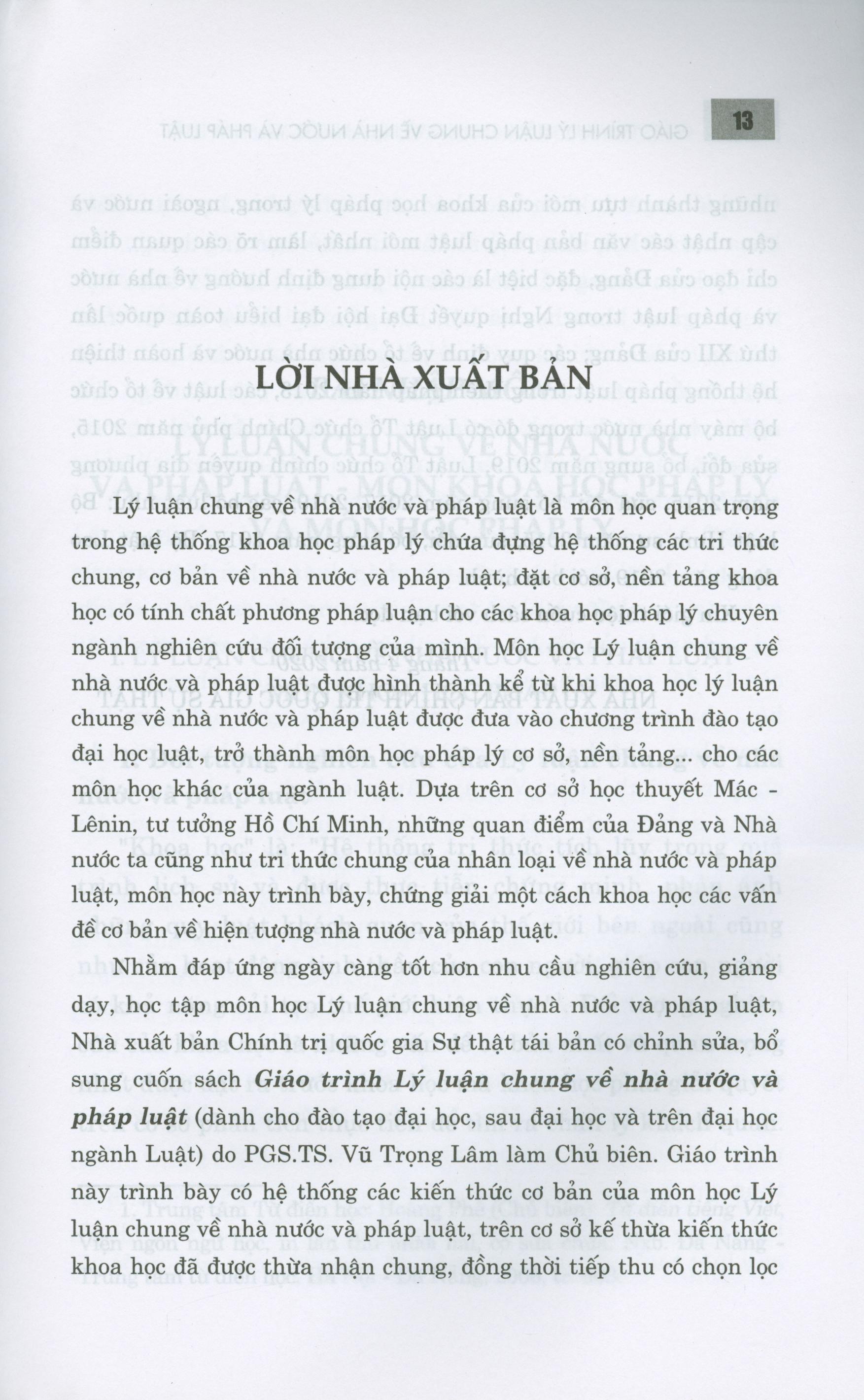Lý luận chung về nhà nước và pháp luật là môn học quan trọng trong hệ thống khoa học pháp lý chứa đựng hệ thống các tri thức chung, cơ bản về nhà nước và pháp luật; đặt cơ sở, nền tảng khoa học có tính chất phương pháp luận cho các khoa học pháp lý chuyên ngành nghiên cứu đối tượng của mình. Môn học Lý luận chung về nhà nước và pháp luật được hình thành kể từ khi khoa học lý luận chung về nhà nước và pháp luật được đưa vào chương trình đào tạo đại học luật, trở thành môn học pháp lý cơ sở, nền tả cho các môn học khác của ngành luật. Dựa trên cơ sở học thuyết Mác - Lênin, tư tưởng Hồ Chí Minh, những quan điểm của Đảng và Nhà nước ta cũng như tri thức chung của nhân loại về nhà nước và pháp luật, môn học này trình bày, chứng giải một cách khoa học các vấn đề cơ bản về hiện tượng nhà nưốc và pháp luật. Nhằm đáp ứng ngày càng tốt hơn nhu cầu nghiên cứu, giảng dạy, học tập môn học Lý luận chung về nhà nước và pháp luật, Nhà xuất bản Chính trị quốc gia Sự thật tái bản có chỉnh sửa, bổ sung cuốn sách Giáo trình Lý luận chung về nhà nước và pháp luật (dành cho đào tạo đại học, sau đại học và trên đại học ngành Luật) do PGS.TS. Vũ Trọng Lâm làm Chủ biên. Giáo trình này trình bày có hệ thống các kiến thức cơ bản của môn học Lý luận chung về nhà nước và pháp luật, trên cơ sở kế thừa kiến thức khoa học đã được thừa nhận chung, đồng thời tiếp thu có chọn lọc