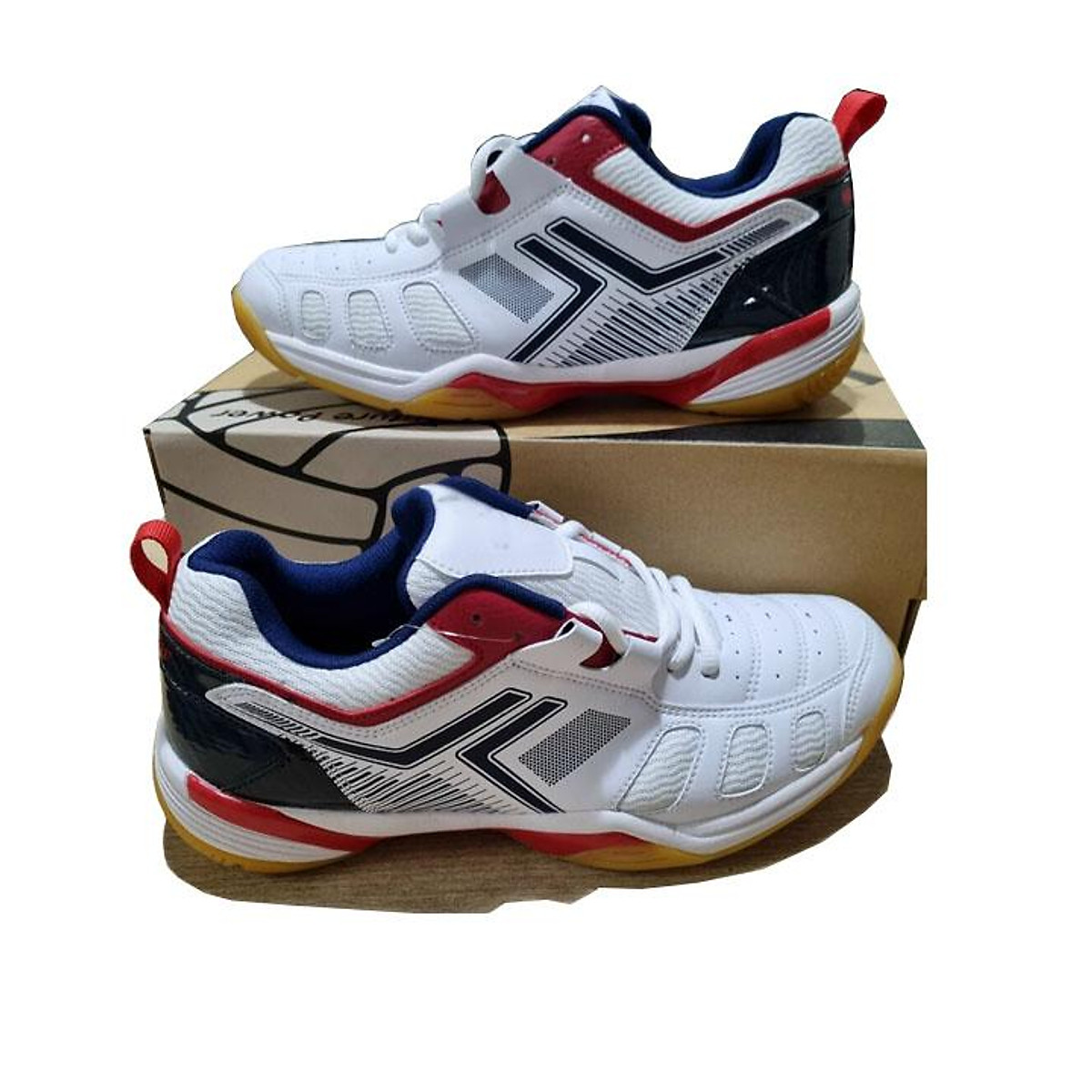 Giày Cầu Lông Mới Nhất Đa Năng Trắng Sọc Đỏ Kiểu dáng thể thao, mạnh mẽ,phù hợp với các bạn trong độ tuổi 12-35 - Đế cao su bền chắc, có độ bám cao. -