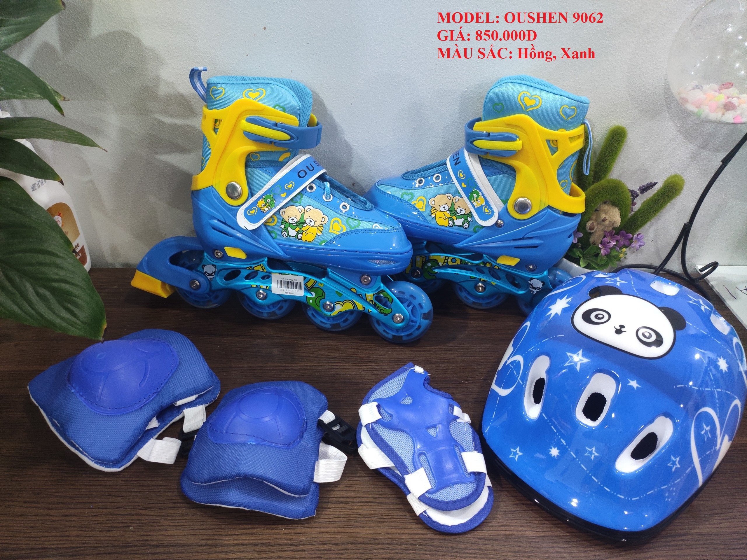 - THÔNG SỐ KỸ THUẬT – Tên sản phẩm: Combo Giày Patin và Bộ Bảo Hộ Trẻ Em 9062 – Combo bao gồm: 1 đôi giày patin, 1 mũ bảo hộ, 1 bộ bảo hộ chân tay 6 miếng (không kèm túi) – Sản xuất tại: Trung Quốc – Loại giày: Trẻ em – Size: S(31-34), M(35-38), L(39-42) – Màu sắc: Xanh, hồng