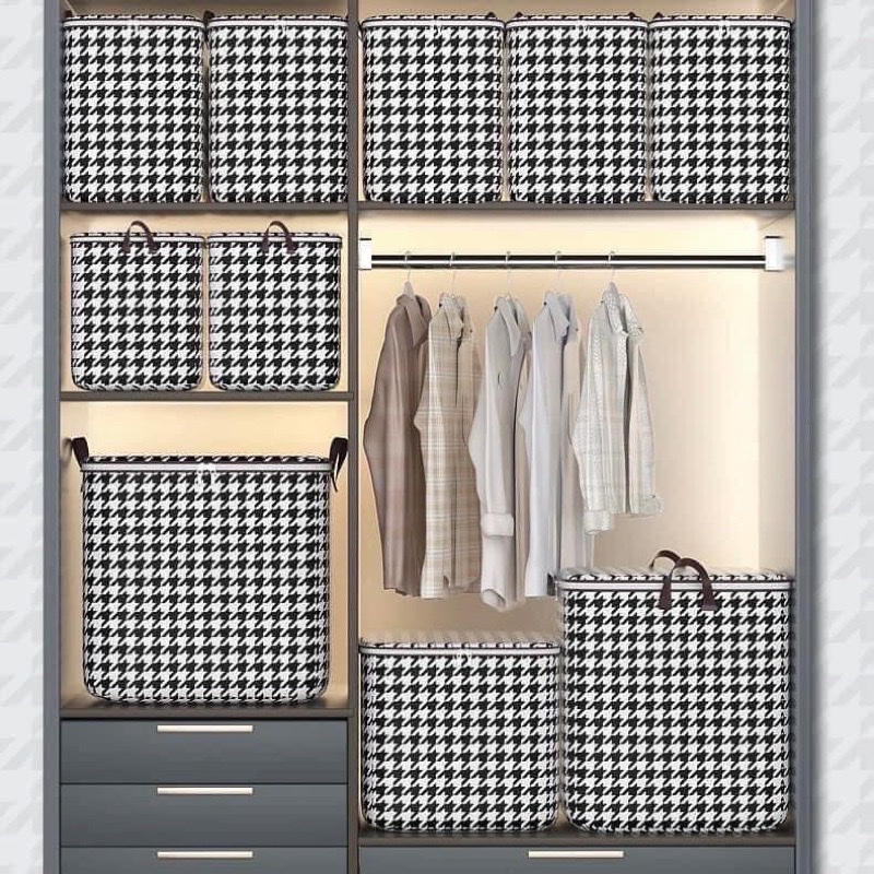 -Giỏ đựng chăn màng quần áo đa năng , họa tiết caro sọc trắng đen cao cấp ,có dây kéo ,quai cầm giúp tiện lợi trong việc cầm , xách di chuyển tiết kiệm không