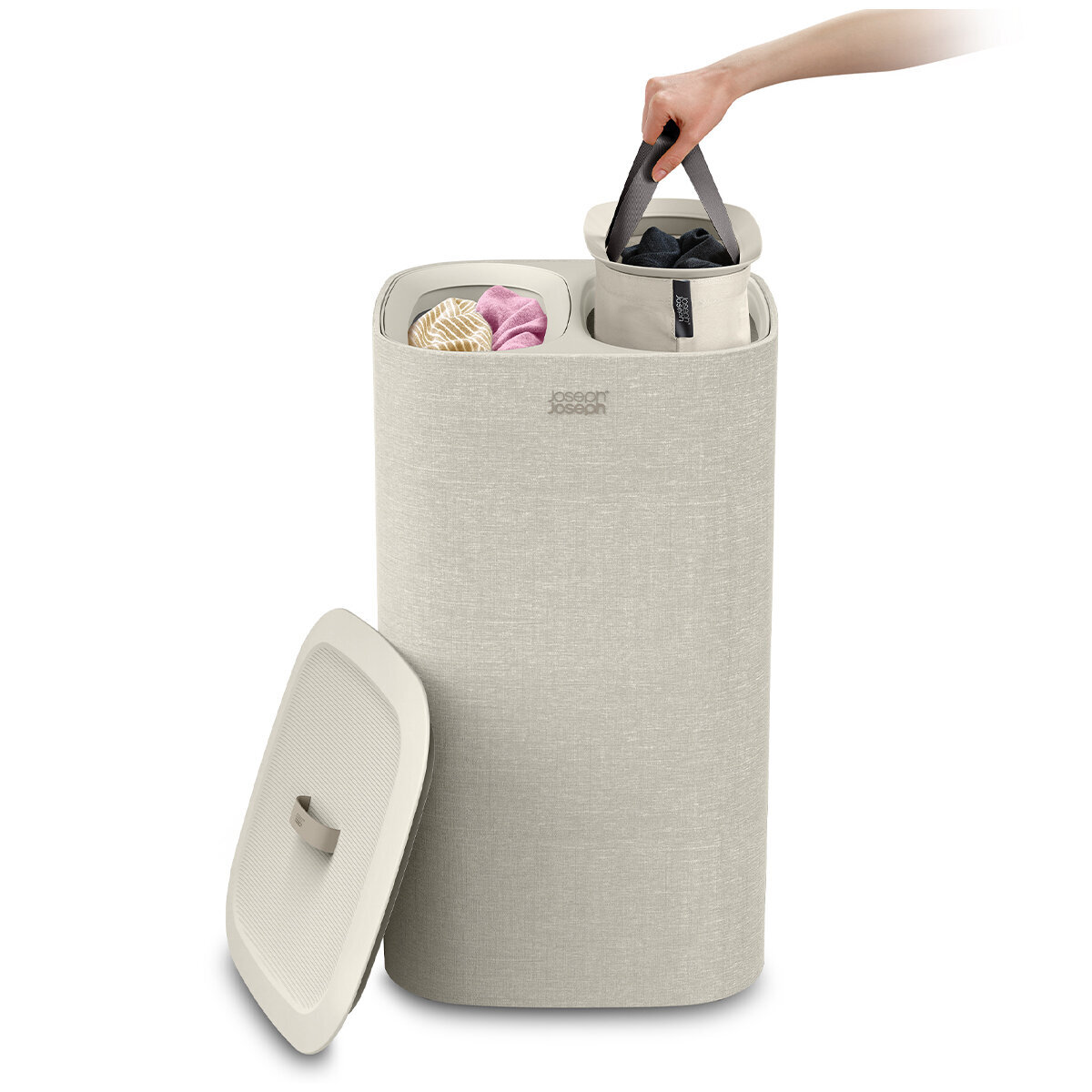 Hai ngăn 30 lít cho phép dễ dàng phân loại các loại vải như đồ sáng, đồ tối và đồ màu Túi tote có thể tháo rời có tay cầm giúp việc mang đồ
