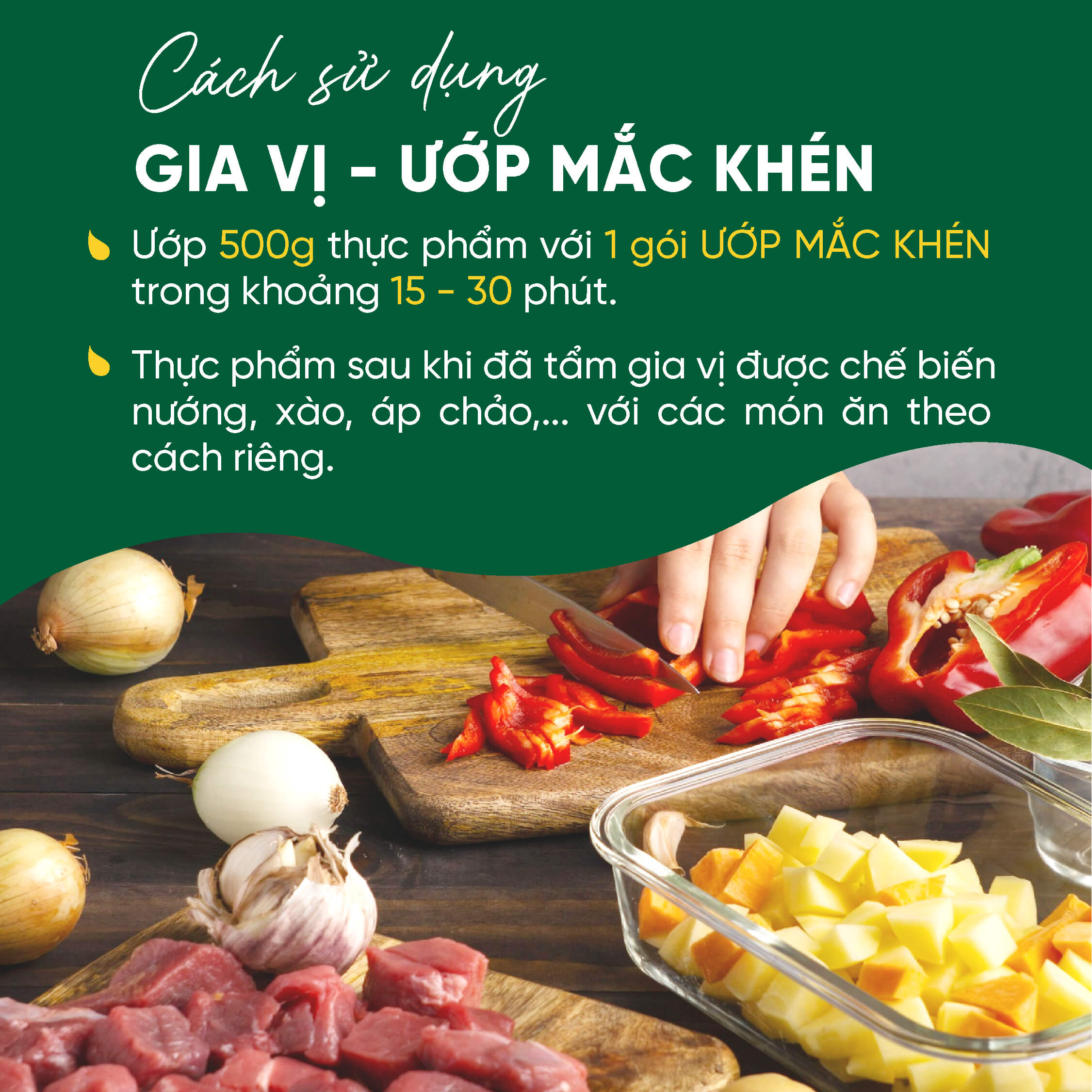 Thông tin sản phẩm Thành phần chính: Muối sấy, đường cát, muối hồng, hạt mắc khén, bột ớt cay, bột chanh, lá chanh,... Năng lượng: 135 kcal Khối lượng tịnh: 10g Hương vị: Cay the nhẹ, thơm đặc trưng mùi mắc khén Bảo quản gói gia vị ướp mắc khén: Bảo quản ở những nơi khô ráo, thoáng mát, tránh để ở nơi có ánh sáng trực tiếp. Bảo quản kín khi mở bao bì và nên sử dụng trong vòng 24 giờ. Hạn sử dụng gói gia vị ướp mắc khén:   Phù hợp với: Mọi nguyên liệu Xuất xứ: Việt Nam 2. Hướng dẫn sử dụng gói gia vị ướp mắc khén 1 gói gia vị dùng để ướp khoảng 500g thực phẩm (thịt, cá, rau củ…). Ướp trong 15 – 30 phút để gia vị thấm đều, tạo nên độ đậm đà vừa phải. Sau khi ướp, thực phẩm có thể được chế biến theo nhiều hình thức như: Nướng, xào, áp chảo hoặc chiên,... Hương thơm đặc trưng của mắc khén Tây Bắc, kết hợp cùng các loại gia vị truyền thống sẽ giúp bữa ăn thêm trọn vẹn và hấp dẫn