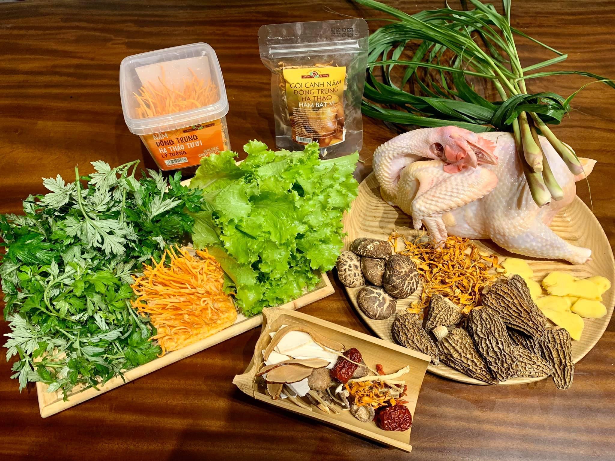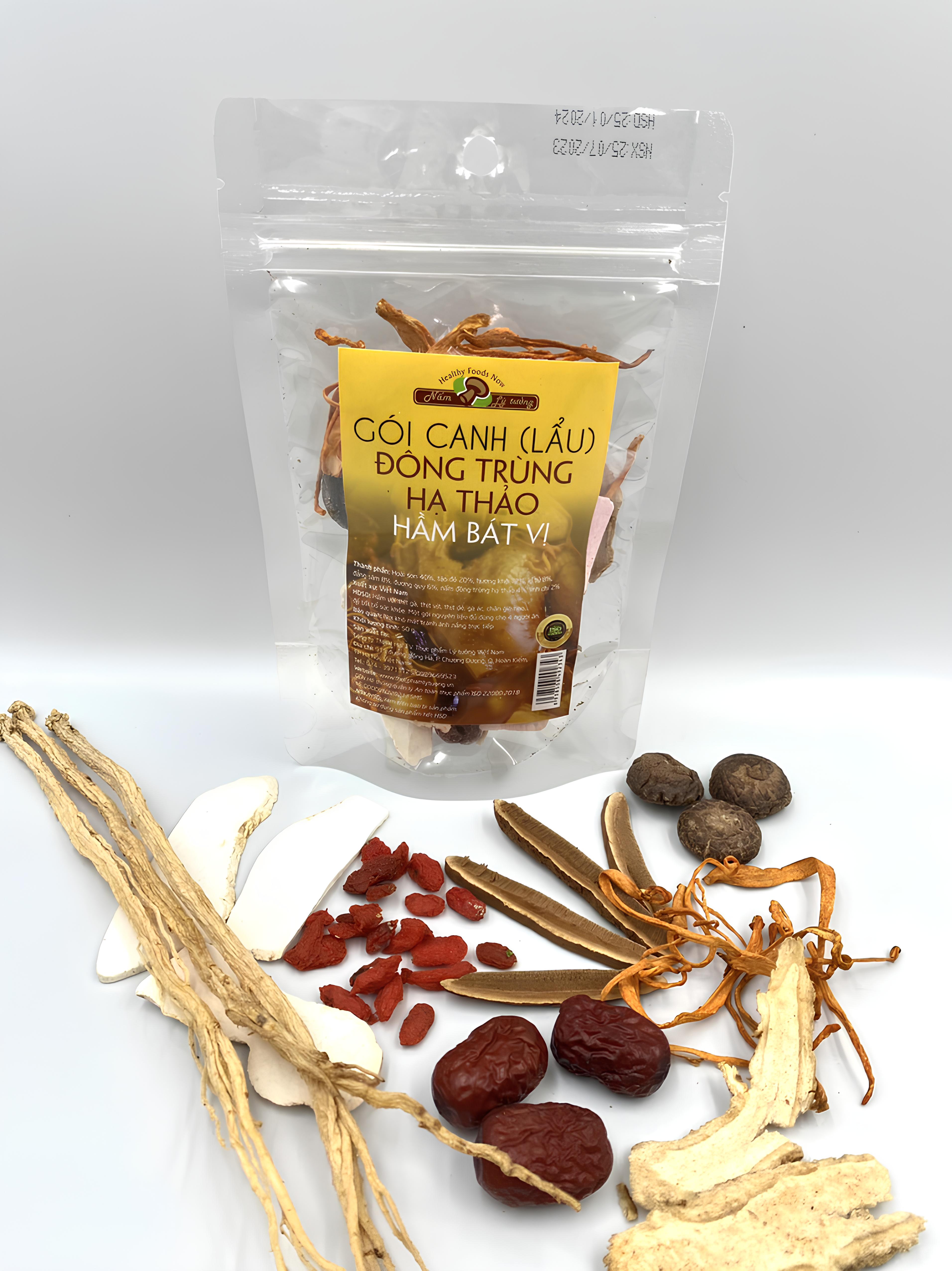 - Gói canh (lẩu) nấm Đông trùng hạ thảo hầm Bát vị bao gồm các thành phần nấm, hạt và thảo quả và đặc biệt có thành phần nấm Đông trùng hạ thảo dùng để