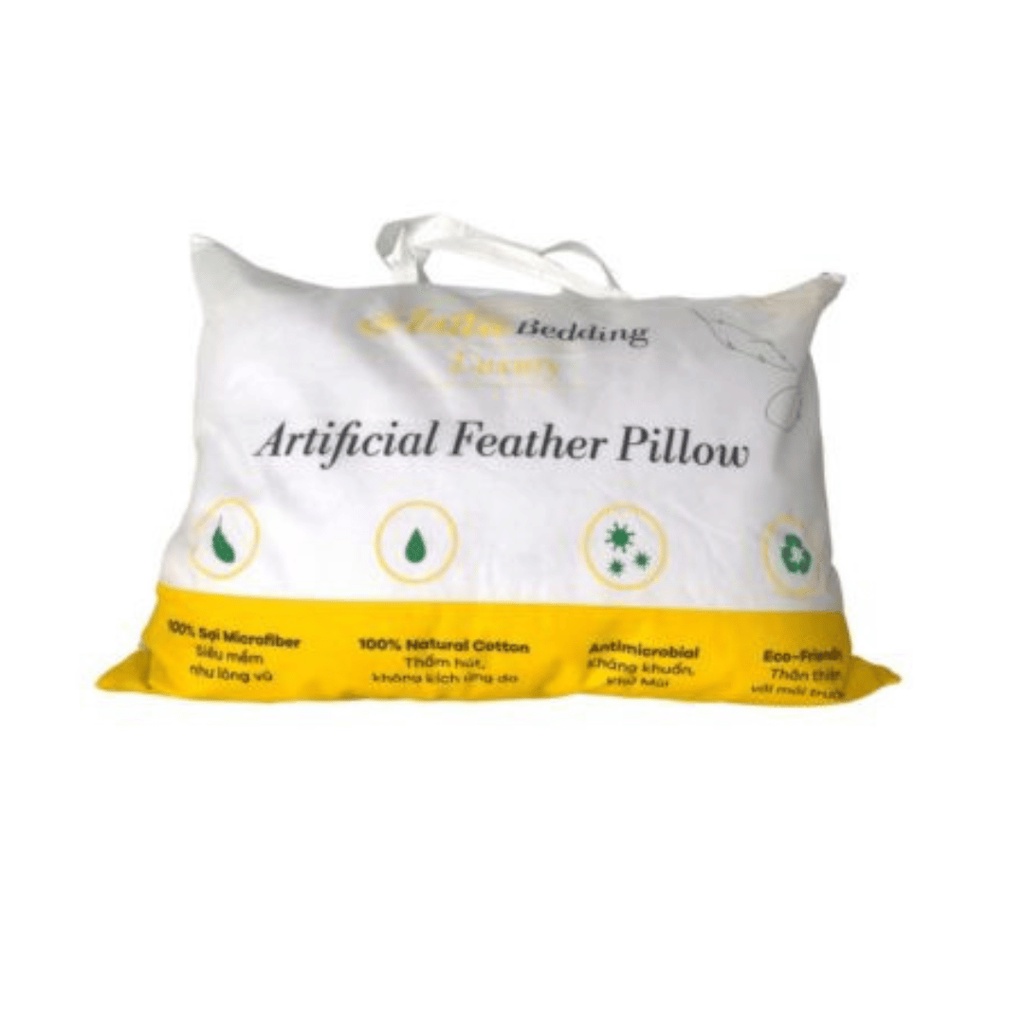 - Gối lông vũ nhân tạo: còn được gọi bằng một cái tên khác là gối giả lông vũ hay gối lông vũ công nghiệp. Được làm từ thành phần là bông microfiber. Không kém phần mềm mại, tơi xốp và êm ái. *Cấu tạo của gối lông vũ