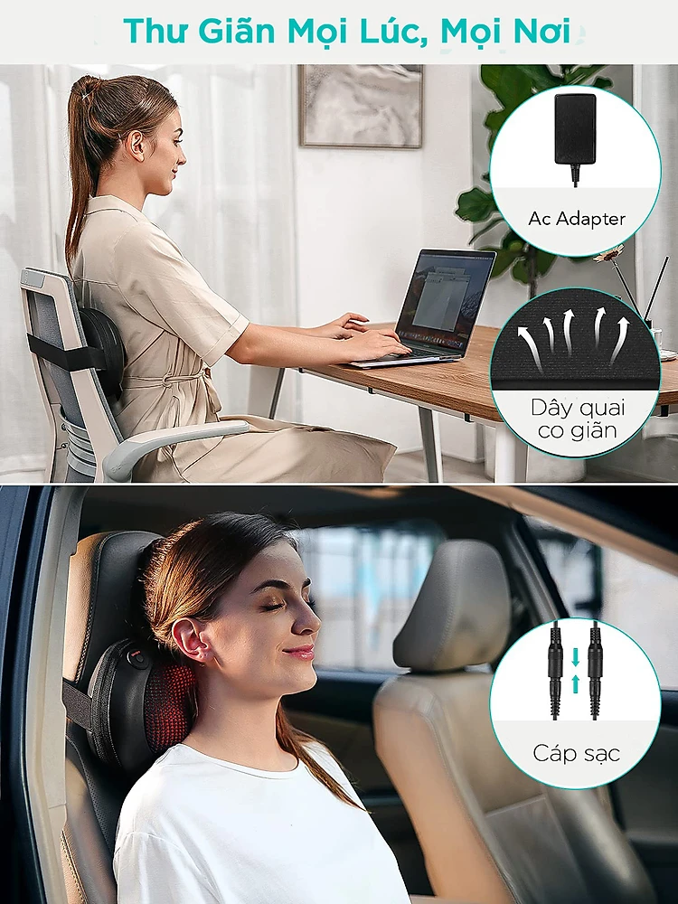 Tính năng - Gối massage không dây sử dụng pin sạc công nghệ cao thế hệ mới giúp bạn dễ dàng mang theo bất kỳ đâu - Tinh tế và nhẹ, chỉ nặng 2,2 kg,
