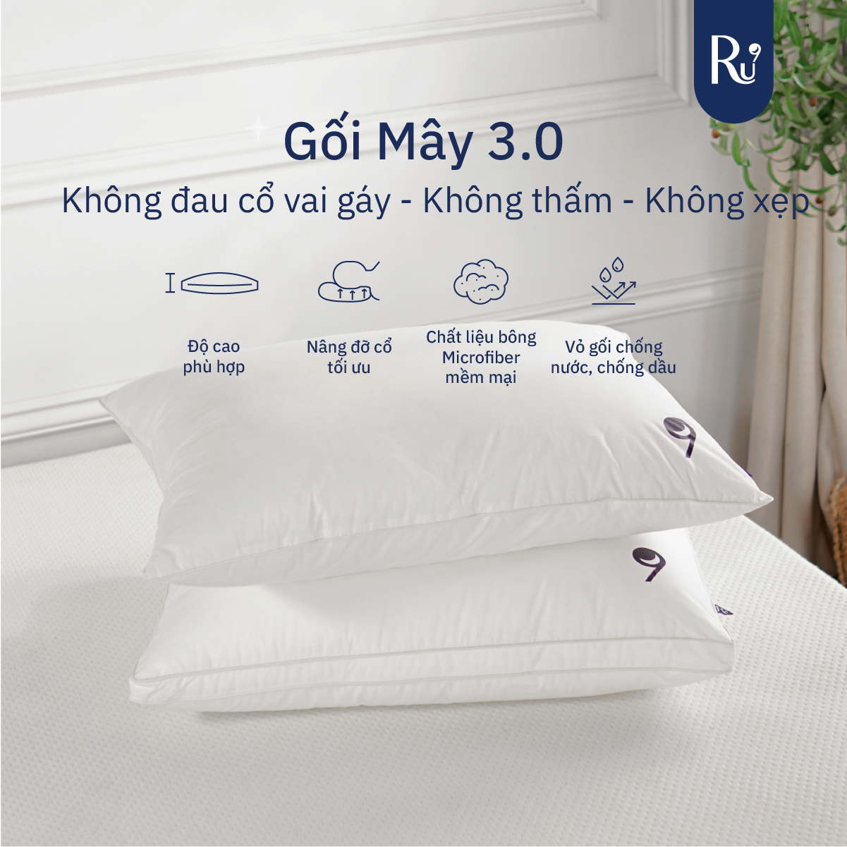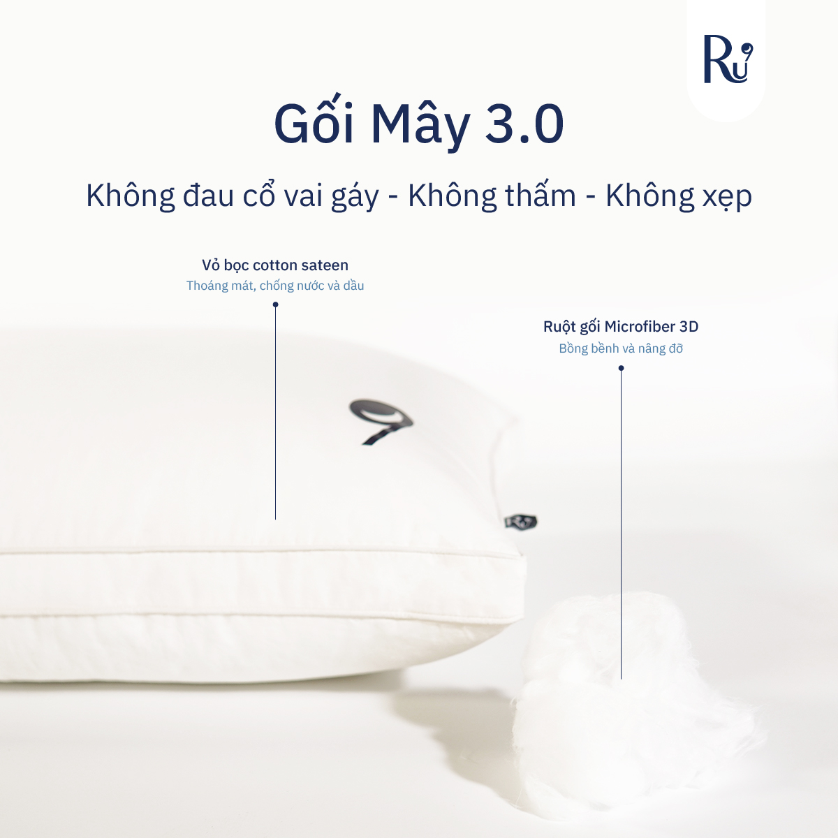 *Chi tiết sản phẩm: Thông tin sản phẩm: Gối Mây Chất liệu Microfiber 3D cao cấp sử dụng làm ruột gối mô phỏng sự bồng bềnh của lông vũ trong khi đảm bảo việc giữ hình dạng và nâng đỡ của gối hàng đêm. Gối Mây 3.0 của Ru9 với tiêu chí: không xẹp - không thấm nước - nâng đỡ cổ vai gáy, đem lại sự thoải mái vượt trội đến bạn