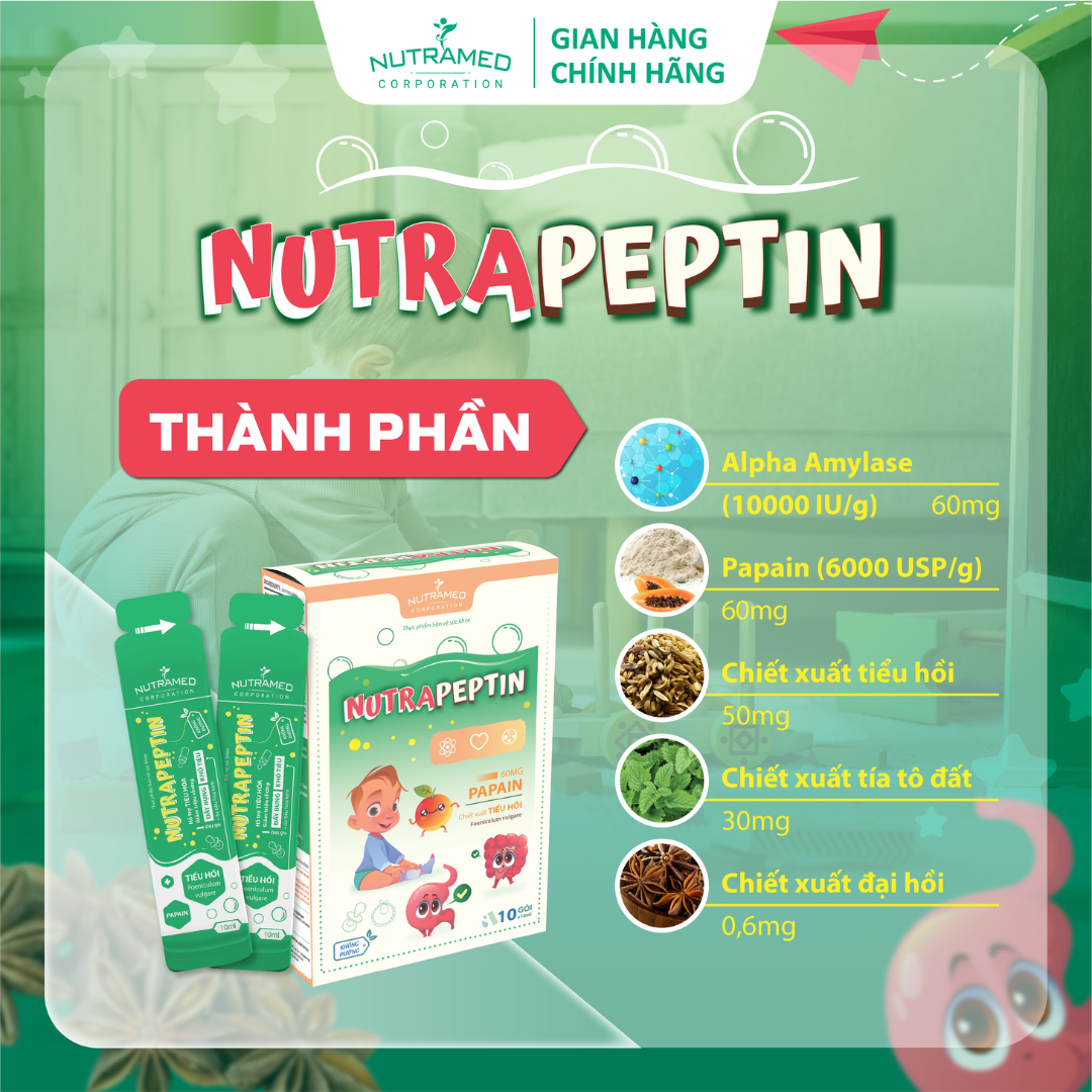NUTRAPEPTIN - Hỗ trợ giảm đầy bụng, khó tiêu do tiêu hoá kém THÀNH PHẦN ️Alpha Amylase, papain, chiết xuất Tiểu hồi, chiết xuất Tía tô đất, chiết xuất Đại hồi CÔNG DỤNG ️Hỗ trợ