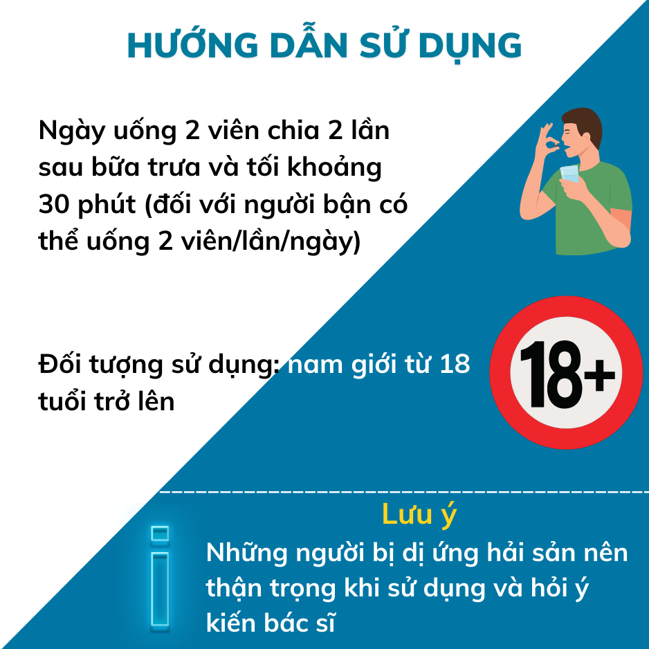 - Đặc biệt, là những nam giới có tuổi đang có dấu hiệu “tắt dục” hoặc có vấn đề về huyết áp, tiểu đường, xơ vữa động mạch muốn cải thiện sức khỏe sinh lý và hiện đang tìm kiếm sản phẩm chiết xuất từ thiên nhiên không tác dụng phụ. HƯỚNG DẪN SỬ DỤNG