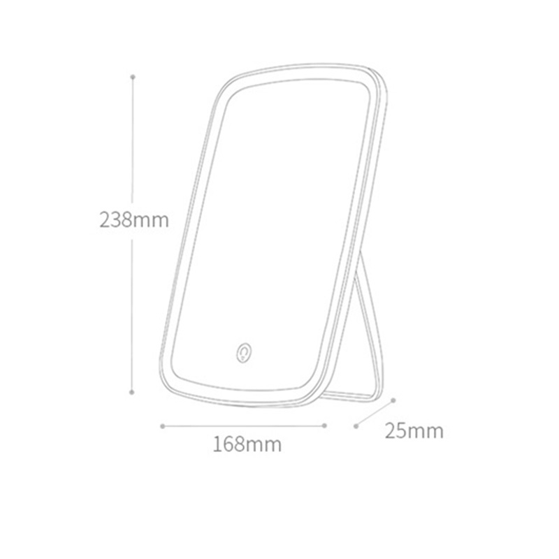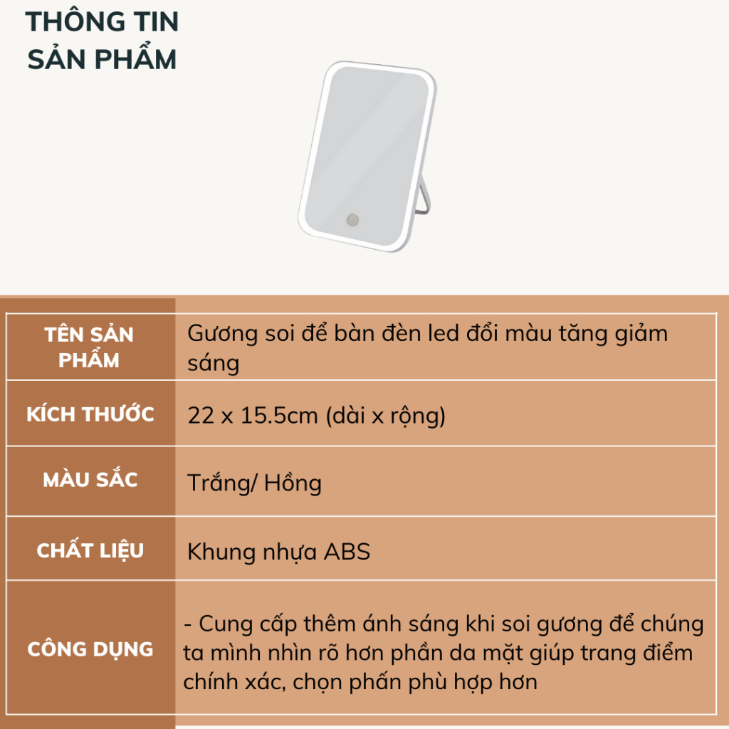 - Chạm vào nút tròn trên gương để tắt/ mở, thay đổi màu đèn, NHẤN và GIỮ nút cảm ứng để tăng giảm sáng Thông số chi tiết Gương trang điểm Kích thước toàn phần: 238 x 168 x 25mm Kích thước gương: 232 x 162 x 2mm Trọng lượng tịnh: 370g Chất liệu: Vỏ nhựa ABS + thủy tinh Phím bấm bật tắt: cảm ứng Nguồn điện: 5V – 1A Thời lượng đèn sáng liên tục: khoảng 4,17 giờ Thời gian sạc: khoảng 3 giờ (lưu ý, sản phẩm chỉ đi kèm theo cáp sạc micro usb, không đi kèm theo củ sạc) Tại sao bạn nên chọn Gương tích hợp LED Toàn bộ mặt sau và chân đế được bao bọc bởi lớp vỏ nhựa ABS phổ biến trong các dòng sản phẩm cao cấp, chống va đập và rất khó bám bụi. Tạo nên một thiết bị vừa thu hút được thị hiếu khách hàng nhờ hình thức, vừa đảm bảo tốt độ bền theo thời gian. Gương trang điểm được trang bị hệ thống 33 đèn LED trải đều bao quanh viền, mô phỏng ánh sáng tự nhiên như ban ngày. Cường độ sáng đạt chuẩn độ rọi 525LUX, cho nguồn sáng không chói, khá giống thật, rõ nét, độ phân giải cao giúp bạn tự tin trang điểm trong những môi trường tốt. Kể cả những công đoạn làm đẹp khó trên khuôn mặt như kẻ mắt, tô điểm chân mày, chuốt mi,… cũng không thể làm khó được bạn. Ngoài ra, trong một vài trường hợp bất khả kháng như cúp điện hoặc dã ngoại qua đêm ở lều trại, bạn cũng có thể dùng gương thay thế cho đèn ngủ.