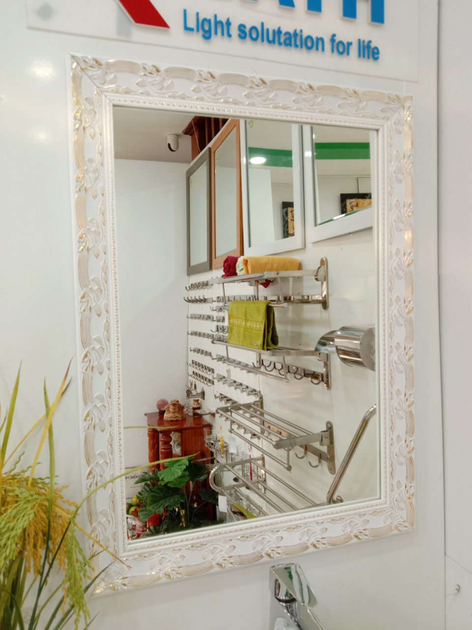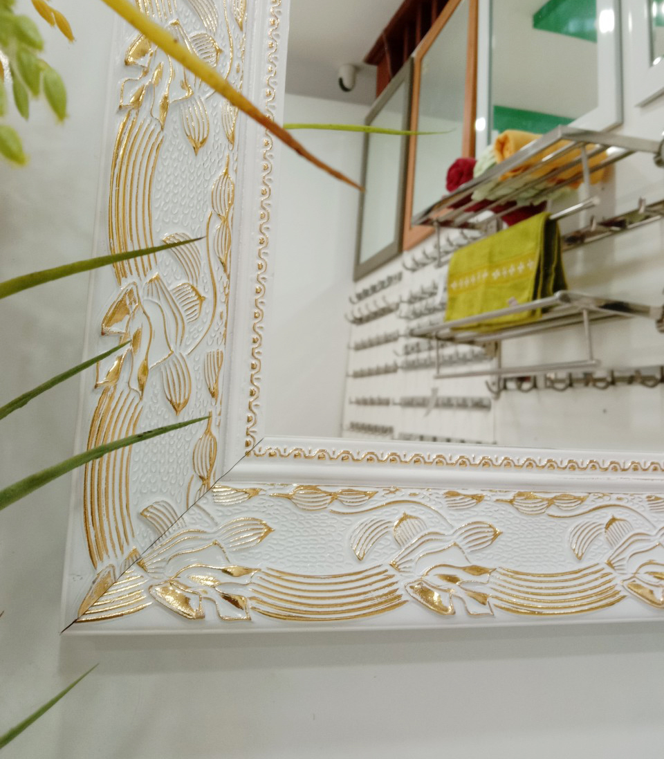 Mua tại TiktokGương soi Kibath khung màu trắng bảng 6 phân họa tiết vàng KT 60x80 cm, KB-129 - Mã số: KB-129 - Kích thước phủ bì 60x80 cm (bảng khung 6 cm dày 2.5cm, kích thước