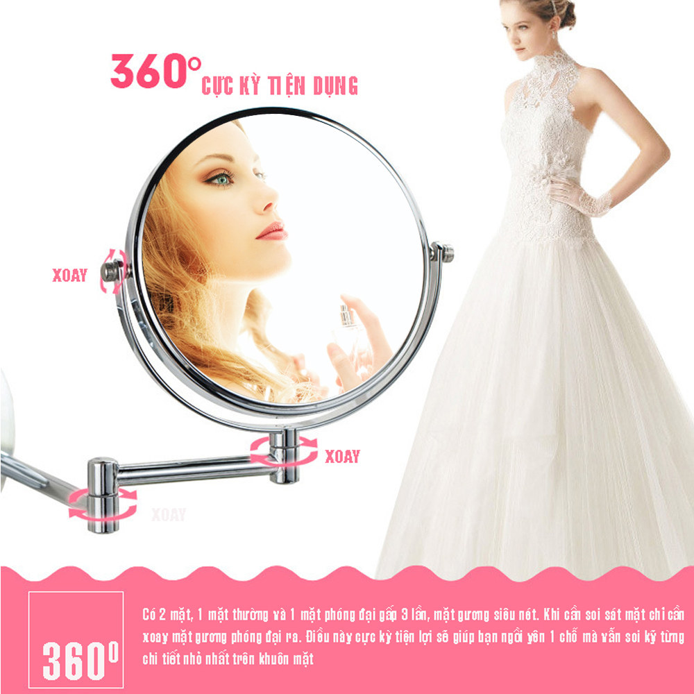 Gương trang điểm phóng đại 3 lần, xoay 360 độ, 2 mặt siêu nét, treo tường phòng tắm, phòng ngủ, Khách sạn, resort, Inox SUS 304, Size 15cm, 18cm, 20cm, Minh House Mô tả: Rất