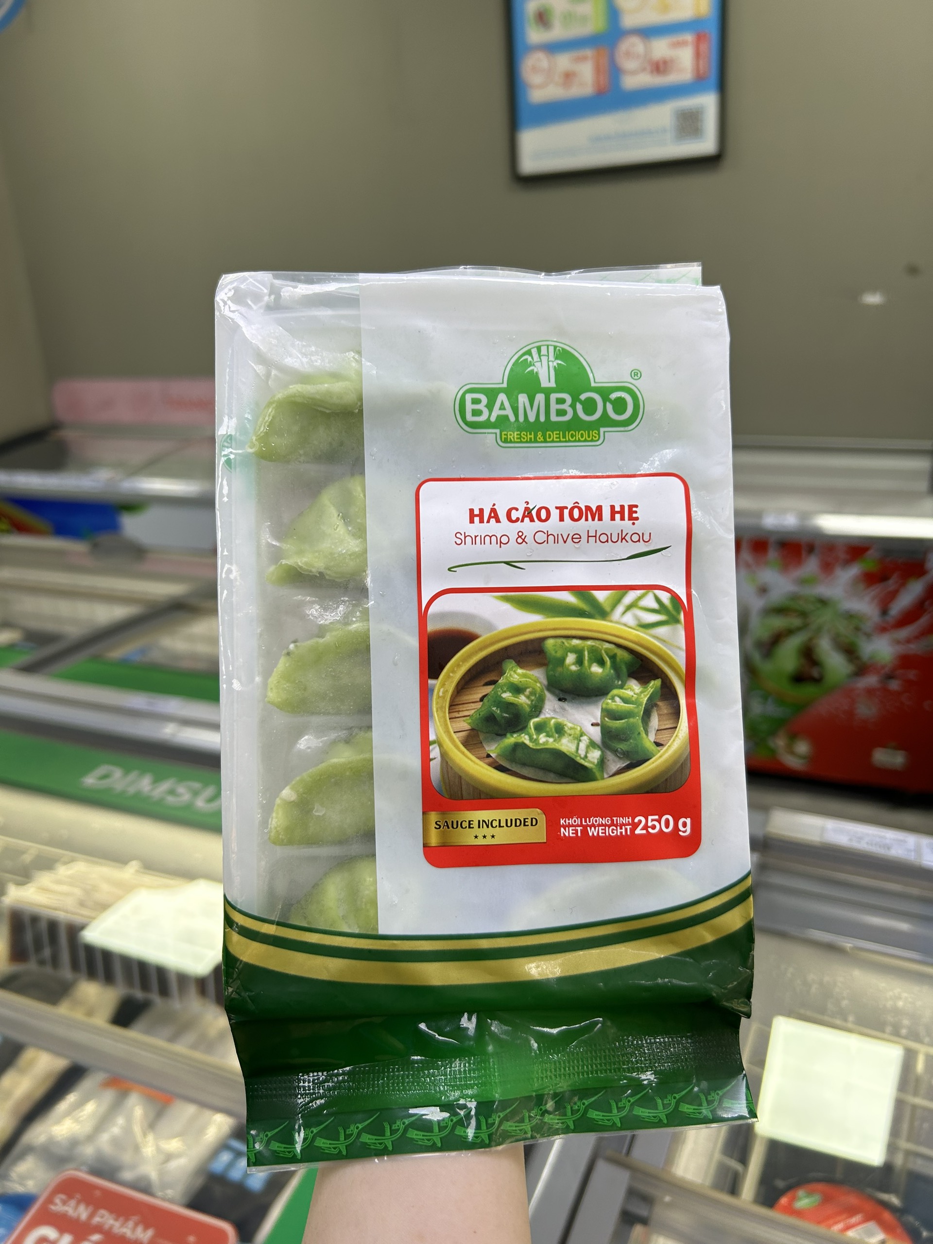 Mua tại TiktokVới sản phẩm tươi sống, trọng lượng thực tế có thể chênh lệch khoảng 10%. ĐỊNH LƯỢNG: 250g/gói THÀNH PHẦN: - Tôm (18%), hẹ (17%), dầu nành, hành lá, lá poro, bột năng, bột bắp, gia vị (muối, đường, tiêu), vỏ bột há cảo - Nước chấm: Giám đỏ, đường phèn, nước tương, tương ớt, nước CÁCH CHẾ BIẾN: Không rã đông. Hấp hoặc microwave. Dùng chung với nước chấm Dimsum - Hấp ở nhiệt độ 100°C khoảng 7-8 phút - Microwave khoảng 2-3 phút BẢO QUẢN: - Bảo quản trong ngăn đá tủ lạnh hoặc ở nhiệt độ -18°C - Không đông lại sau khi đã rã đông HSD: 12 tháng