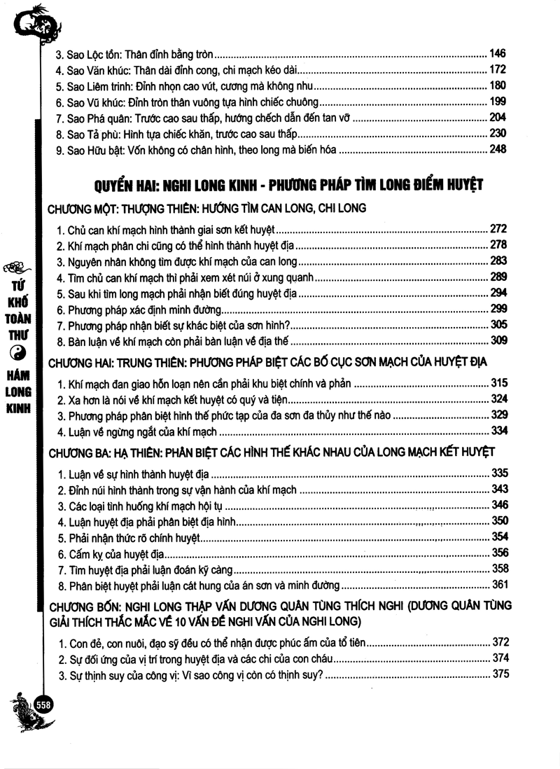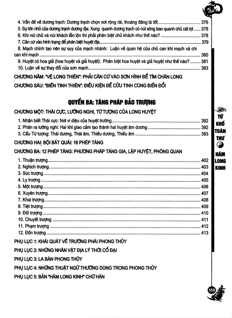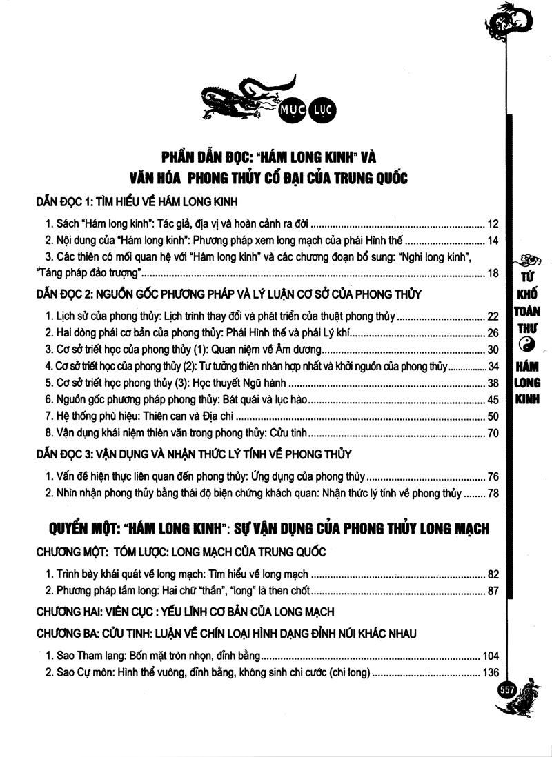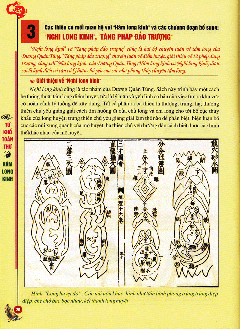 Cuốn sách giới thiệu về các loại long mạch ở rừng núi, thành thị, đồng bằng. Cuốn sách lấy “Hám long kinh” của Dương Quân Tùng làm bản chính, thêm vào các thiên gần gũi cũng bàn về long mạch của phái phong thủy là “Nghi long kinh” và “Táng pháp đảo trượng”, dùng thủ pháp biên tập hiện đại như minh họa, đồ biểu, đồ giải để tiến hành trình bày, giải thích một cách sinh động nguyên bản. N