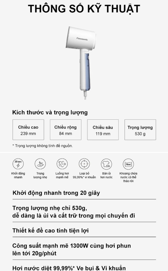 Mua tại TiktokTHÔNG TIN CHI TIẾT: Bàn ủi hơi nước cầm tay Panasonic NI-GHD015WRA: Giải pháp là ủi tiện lợi cho mọi hành trình. NI-GHD015WRA là bàn ủi hơi nước cầm tay đến từ thương hiệu Panasonic nổi tiếng Nhật Bản. Với thiết kế nhỏ gọn, trọng lượng nhẹ chỉ 530g, cùng khả năng khởi động nhanh chỉ trong 20 giây, NI-GHD015WRA là người bạn đồng hành lý tưởng cho mọi chuyến đi của bạn. ĐẶC ĐIỂM NỔI BẬT: