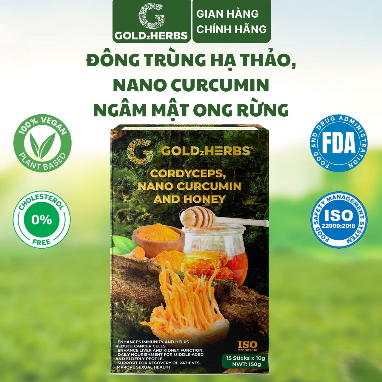 ✨Hàng chính hãng - Đông trùng hạ thảo, Nano Curcumin ngâm mật ong rừng GoldzHerbs, 100% mật ong nguyên chất – Hũ 300g/ Hộp 15 gói