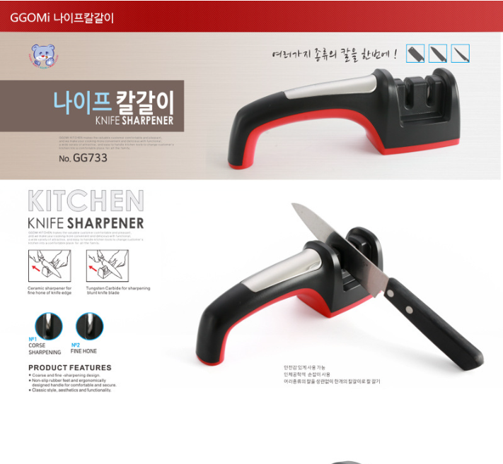 Mài dao 2 lưỡi của GGOMi Hàn Quốc GG733 có tay cầm bằng nhựa ABS và TPR chắc chắn và bền bỉ theo thời gian và trong quá trình sử dụng. Mài dao có 2 lưỡi mài bằng thép không gỉ