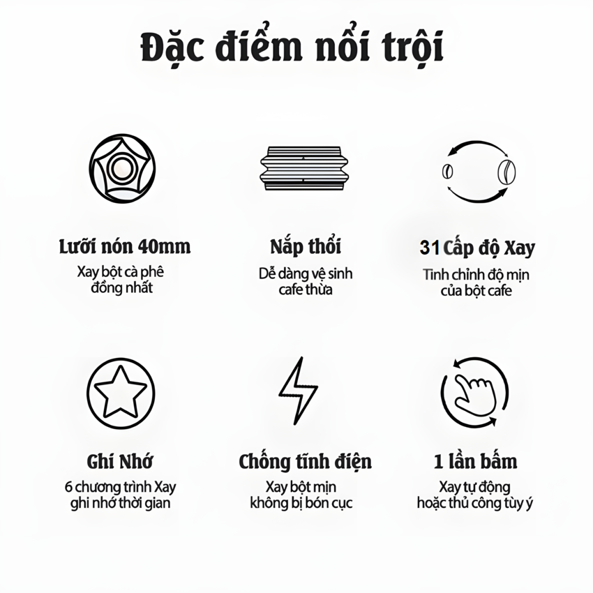 - Với lưỡi dao chất liệu thép không gỉ SS420 bền bỉ bền bỉ sở hữu 31 cấp độ xay, từ dạng thô đến dạng mịn. Chính vì thế nó có thể đáp ứng tối thiểu độ mịn cho 1 ly cà phê espresso chuẩn Ý.