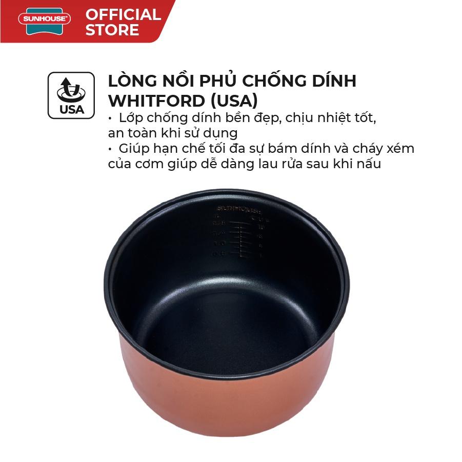 Lòng nồi cơm điện SUNHOUSE được làm từ hợp kim nhôm phủ chống dính chịu được nhiệt độ cao, không chứa các độc tố gây hại cho sức khỏe.