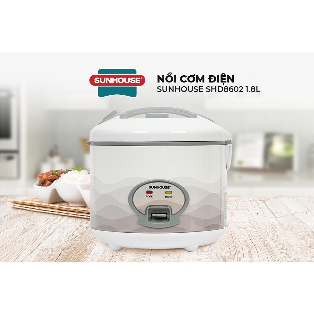 Nồi cơm điện 1.8L SUNHOUSE SHD8602- Hàng chính hãng ĐẶC ĐIỂM: Đường kính mâm nhiệt lớn, tỏa nhiệt đều, cơm ngon hơn Thân nồi bằng nhựa ABS nguyên sinh, siêu bền Lòng