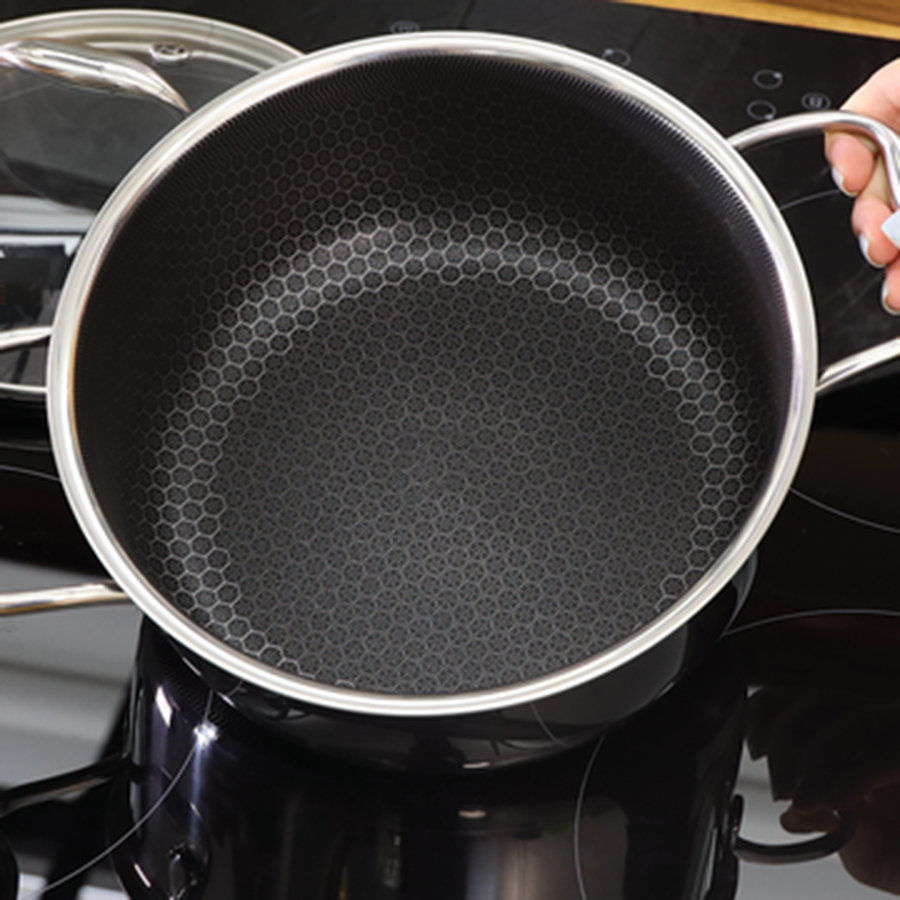 Nồi inox thân 3 lớp, lớp chống dính bên dưới trụ inox an toàn, không PFOA, không PTFE. Thân nồi dày giữ nhiệt nên nấu nhanh hơn. Có thể vệ sinh trong máy rửa chén và không kén bếp: dùng tốt trên cả bếp từ, điện, gas, hồng ngoại....