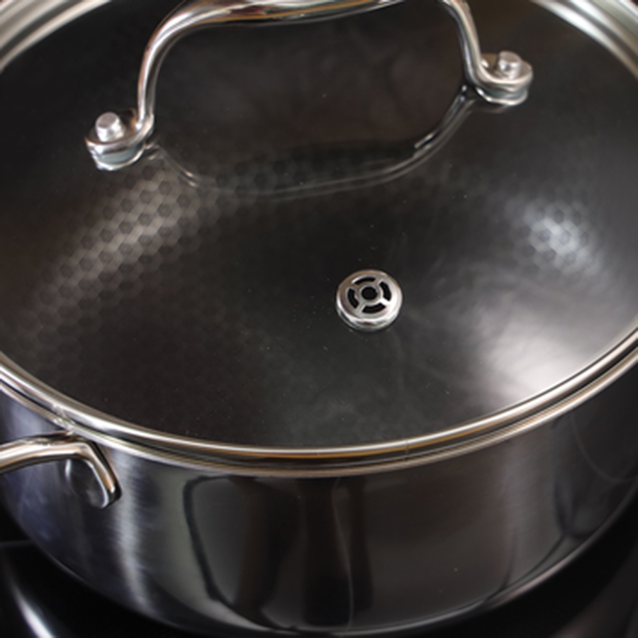 Nồi iMat Hybrid là sự kết hợp giữa chất liệu inox và bề mặt chống dính ứng dụng công nghệ Blackcube, chứa các trụ inox trồi cao giúp dẫn nhiệt tốt đến thực phẩm. Nồi iMat Hybrid cho phép bạn chế biến các món ăn có hương vị thơm ngon hảo hạng, đồng thời có thể thoải mái sử dụng các dụng cụ nấu bằng kim loại không lo trầy xước.