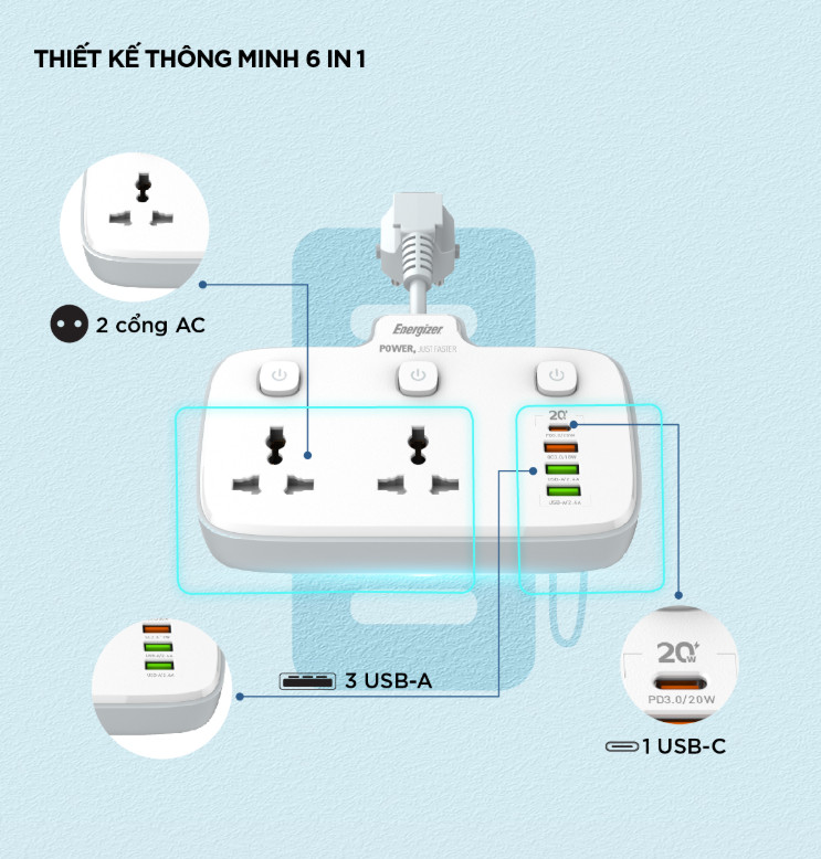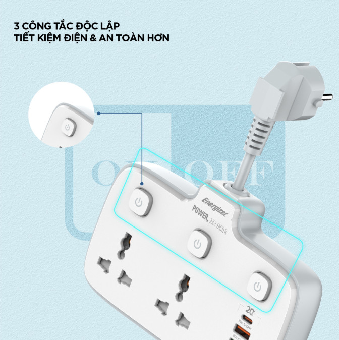 Ổ cắm đa năng cách điện bền đẹp. Chịu nhiệt, chống cháy: 750ºC Chống sét ( có dây tiếp đất) Chiều dài dây điện: 3 mét * CHI TIẾT SẢN PHẨM Chân tiếp xúc với
