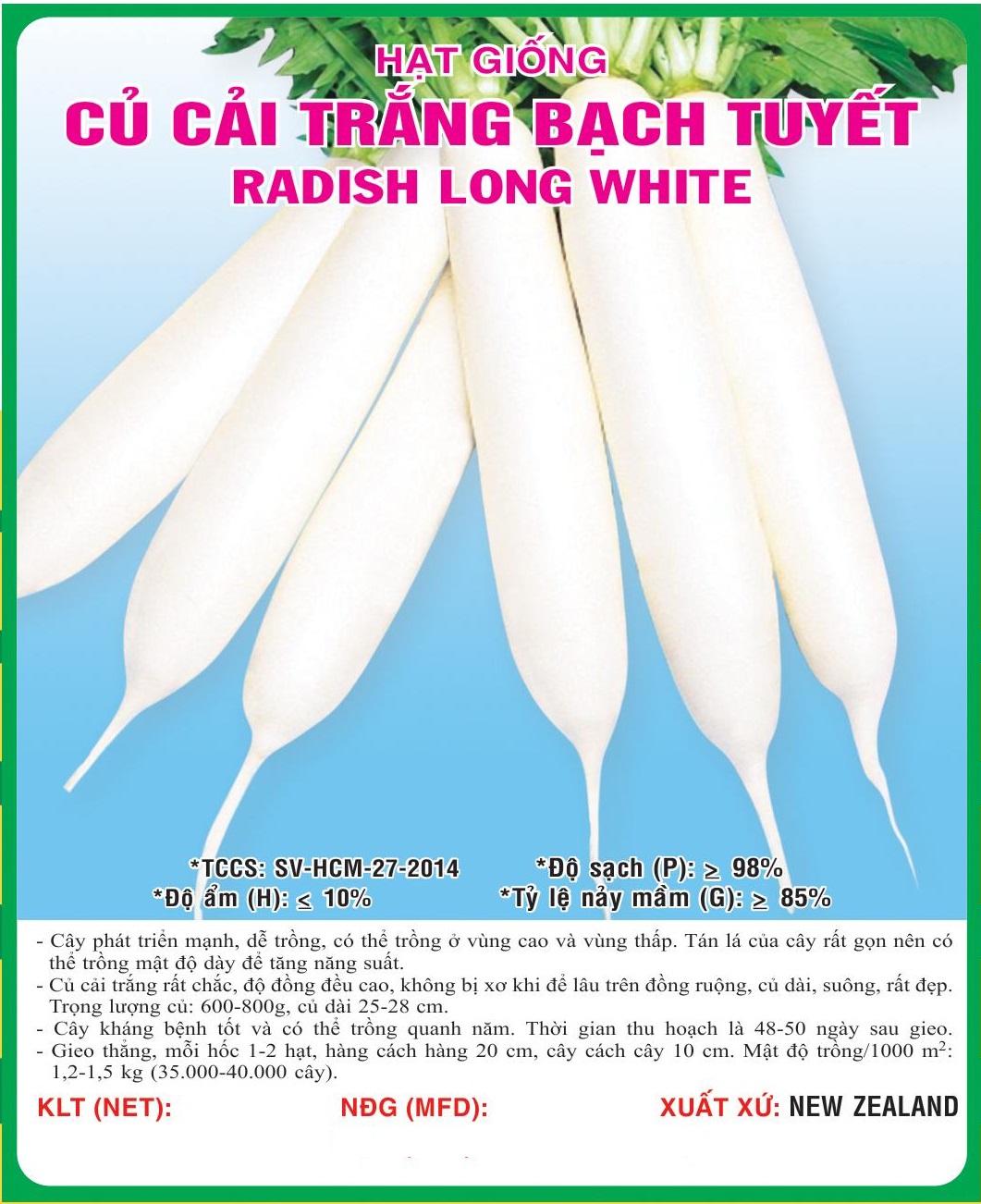 Đặc tính giống: Hạt Giống Củ Cải Trắng Bạch Tuyết là chủng loại có xuất xứ từ Pháp, nhập khẩu từ New Zealand. Kháng bệnh tốt, cây phát triển mạnh, dễ trồng, có thể trồng ở vùng cao và vùng thấp. Tán lá của cây rất gọn nên có thể trồng mật độ dày để tăng năng suất. Củ cải trắng Bạch Tuyết rất chắc, độ đồng đều cao không bị xơ khi để lâu trên đồng ruộng, củ dài suông rất đẹp. Trọng lượng củ: 600 – 800 g, củ dài 25–28 cm