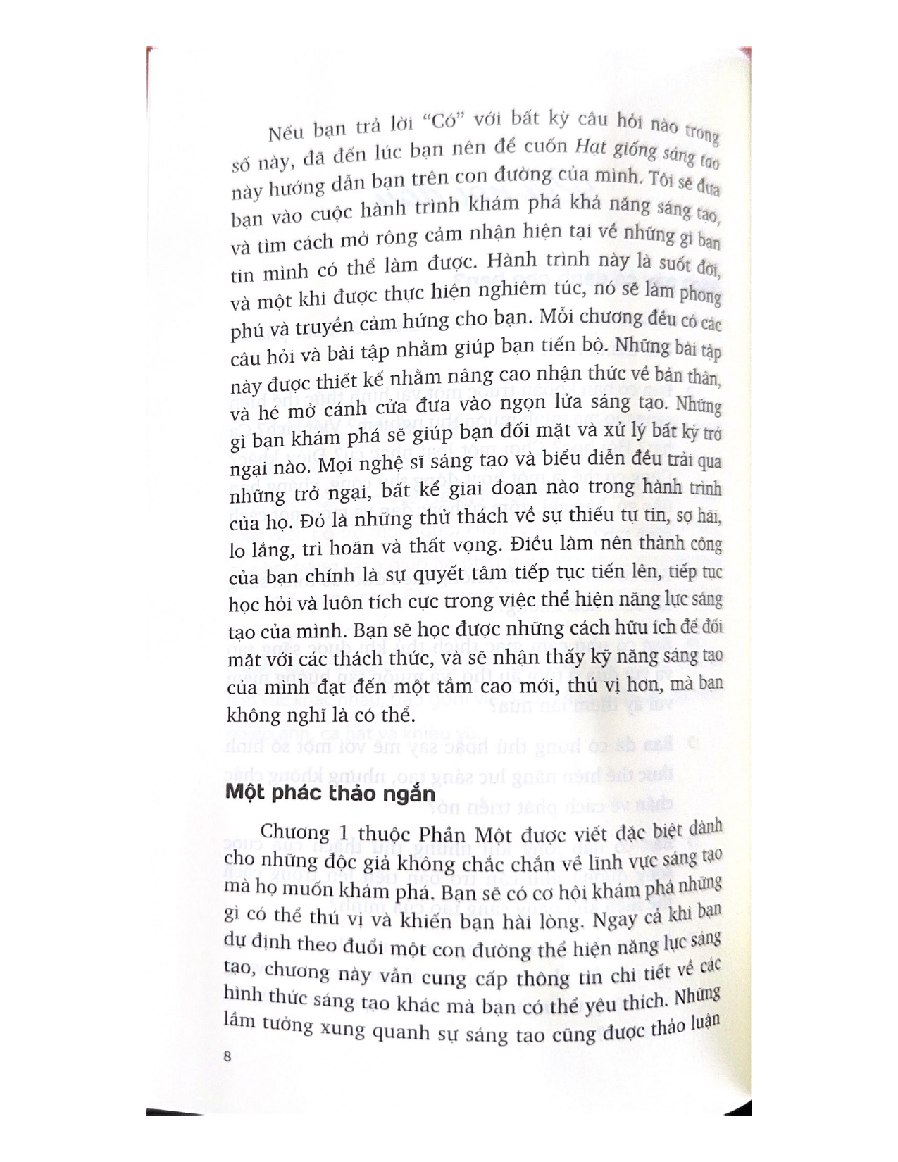 - Giới thiệu Hạt Giống Sáng Tạo Đây thực sự là cuốn sách dành cho tất cả mọi người. Mỗi chương sẽ cho bạn thấy các chiến lược đơn giản để nhận diện và nuôi dưỡng những kỹ năng sáng tạo của mình. Quan trọng hơn là, sách hướng dẫn các kỹ năng sống một cách đơn giản và thực tế, giúp hành trình của bạn trở nên thú vị hơn. Kỹ năng, Thử nghiệm, Đánh giá và Khám phá: “Phương pháp hạt giống sáng tạo” là một cách trao bản chất của quá trình sáng tạo cho những người mới bắt đầu và cả những người đã trải nghiệm sáng tạo lâu năm. Hạt giống sáng tạo là cuốn sách hướng dẫn hoàn hảo cho bất kỳ ai quan tâm đến việc khám phá một số hình thức thể hiện sáng tạo. Ngay cả khi nghĩ rằng mình không có một chút năng khiếu sáng tạo nào, bạn vẫn có thể khám phá và nuôi dưỡng một khía cạnh mới và thú vị trong cuộc sống.