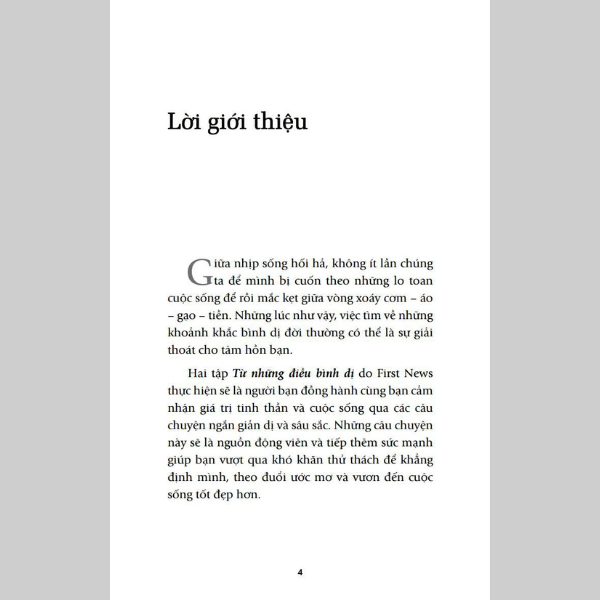 Tuyển tập Từ những điều bình dị gồm 2 cuốn (tập 3, tập 4) nằm trong bộ sách Hạt giống tâm hồn 16 quyển. Chung một chủ đề, hai tập sách Từ những điều bình dị là những câu chuyện dung dị về những con người rất đỗi bình thường trong cuộc sống. Đôi lúc, đó là câu chuyện về cậu bé với chú chó nhỏ khuyết tật. Đôi lúc, lại là câu chuyện về cô con gái không thích tiếng hát của người cha, hay chuyện một bác nông dân luôn sẵn lòng chia sẻ giống ngô tốt cho mọi người xung quanh… Điểm chung của những câu chuyện này là chúng đều chứa đựng những bài học ý nghĩa, mang lại cho bạn niềm lạc quan, niềm tin, tình yêu cũng như thêm trân trọng những gì đang có trong cuộc sống.