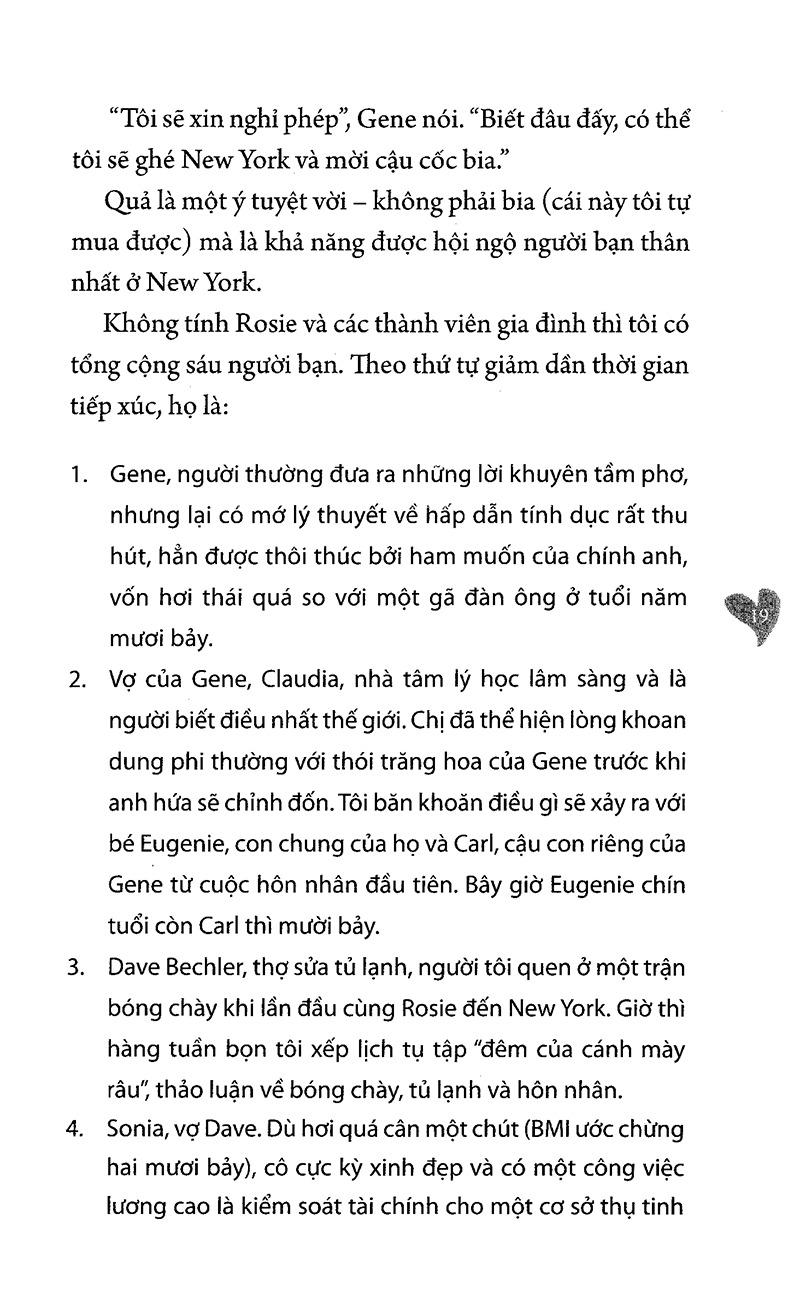 Hiệu Ứng Rosie Phần tiếp theo của cuốn tiểu thuyết hài hước số 1 nước Úc 'Dự Án Rosie' Sau khi Dự Án Vợ kết thúc, nhà di truyền học bốn mươi mốt tuổi Don Tillman cùng 'sao chổi' Rosie chuyến đến New York và tận hưởng mười tháng mười ngày nên vợ nên chồng ngọt ngào, dù Don phải hy sinh những bữa ăn được cân đối hoàn hảo dinh dưỡng, chạy theo một lịch trình 'yêu' đầy bất ngờ và không thể dự đoán nổi. Nhưng một lần nữa, nàng Rosie đã thả cả chùm bom hạng nặng. Và chàng Don phải đương đầu với thử thách lớn nhất giáng xuống cuộc đời vốn ngăn nắp đồng thời xoay xở để không bị trục xuất, bị khởi kiện và bị ô danh với tư cách một nhà khoa học. Liệu Don Tillman đã sẵn sàng để trở thành người đàn ông chàng muốn hướng đến hay chưa? Hay liệu chàng có quay trở lại nếp sống cũ và đối mặt với nguy cơ vĩnh viễn mất đi Rosie hay không?