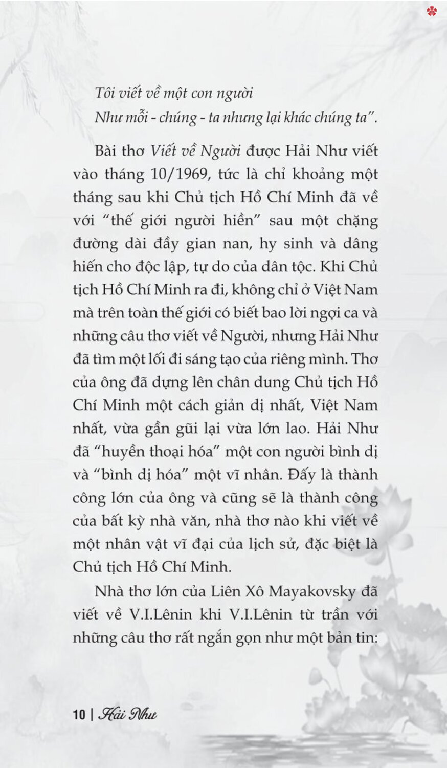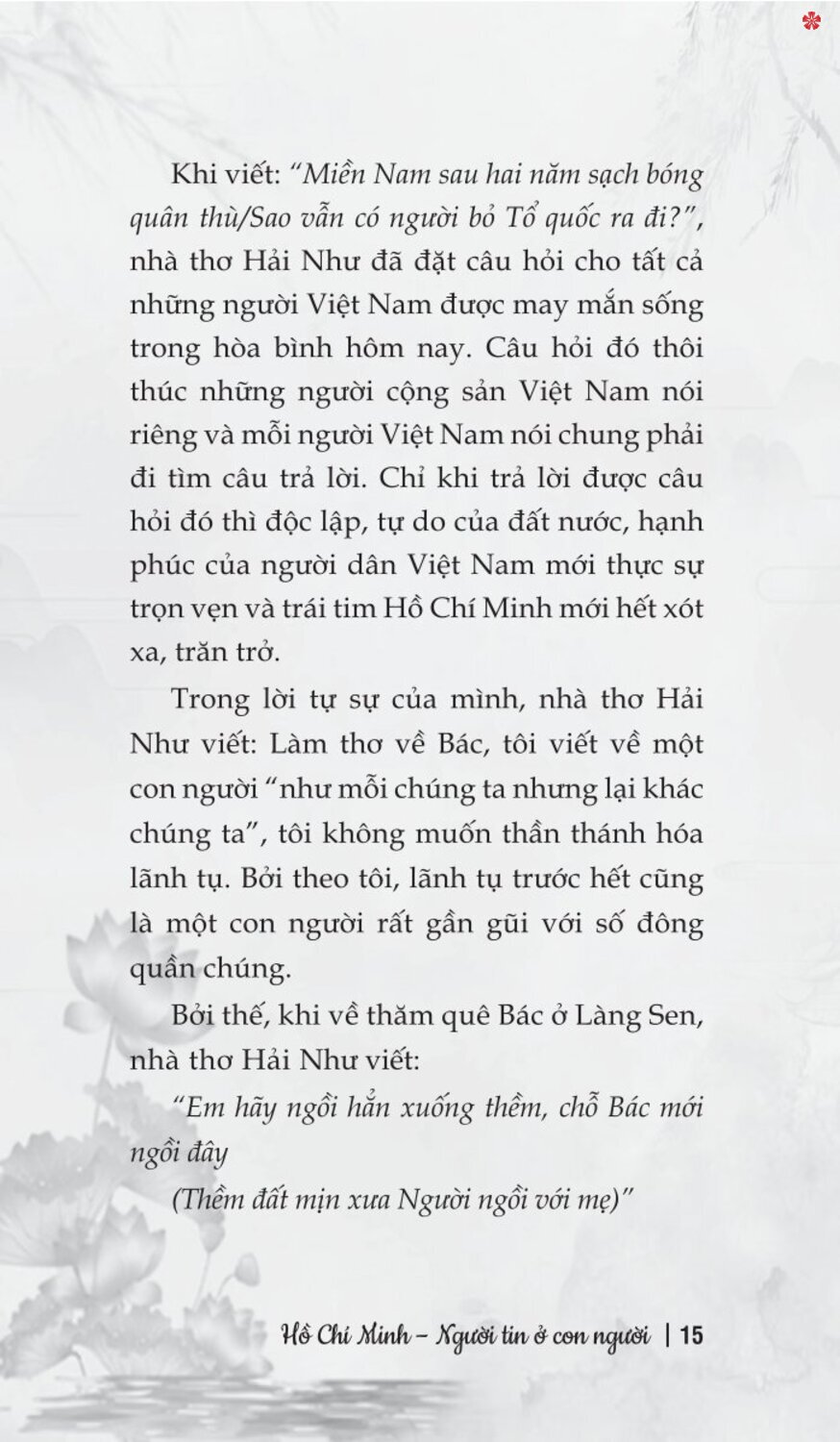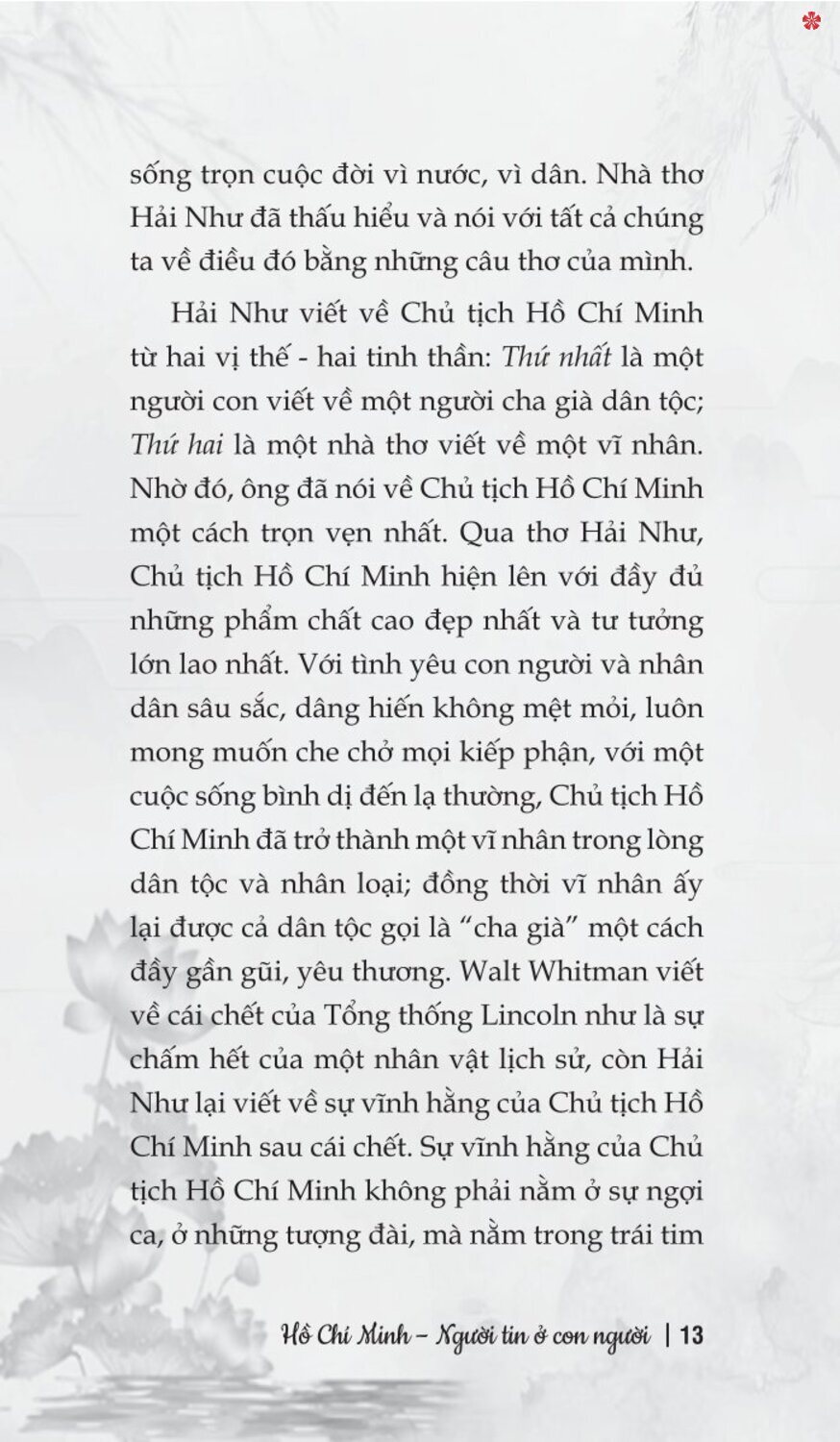 Mua tại TiktokTập thơ Hồ Chí Minh – Người tin ở con người của nhà thơ Hải Như do Nhà xuất bản Chính trị quốc gia Sự thật xuất bản có bài dài, bài ngắn, thậm chí là rất ngắn nhưng tất cả đều toát lên tư tưởng, phong cách của Chủ tịch Hồ Chí Minh - một nhà lãnh đạo thiên tài nhưng luôn gần dân, sát dân, vì dân. Tập thơ không chỉ là một tác phẩm văn học mà còn là tài liệu hữu ích cho việc giáo dục tư tưởng, đạo đức, phong cách Hồ Chí Minh.