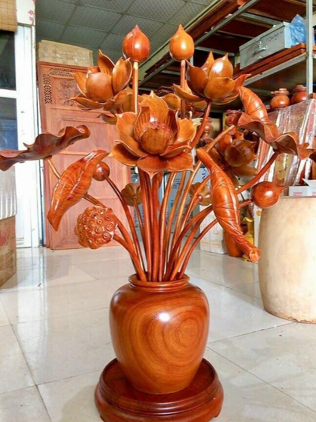 _ Bình hoa sen bằng gỗ hương được tiện khắc ,phân cành lá ,hoa,gương , rất tỉ mỉ tinh sảo kỳ công ,Đi hầu hết tất cả mọi chi tiết góc ngách nội dung hoa văn của bình hoa ,Đều được ngọt tỉa ,chỉnh sửa hoàn toàn bằng tay thủ công .Đồng thời hoa sen gỗ hương và bình được kiểm định rất kỹ lưỡng như cho vào thẩm sấy cho gỗ kiệt .Mục đích trống dập nứt vênh mo mối mọt .Kết hợp với trà nhám ,đánh giấy giáp nhiều nước cho sạch sẽ ,sờ mát lạnh ,Rồi cho vào phun lót làm bóng mờ để giữ lại mầu sắc vân gỗ tự nhiên .Bình hoa sen được làm và hoàn thiện do bàn tay khối óc tài hoa ,Từ những người thợ giàu kinh nghiệm ,Cũng như tay nghề cao trong làng nghề truyền thống .Chính vì thế bình hoa ,bằng gỗ hương đã đáp ứng đầy đủ những tiêu trí ( Đẹp bền rẻ ) Thẩm mỹ nghệ thuật với chất lượng tuyệt vời