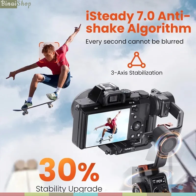 Gimbal Hohem Isteady M6 / M6 KIT sử dụng thuật toán chống rung isteady 7.0 mới nhất mang lại khả năng cân bằng đáng kinh ngạc, cùng với 3 trục động cơ mạnh mẽ tải trọng
