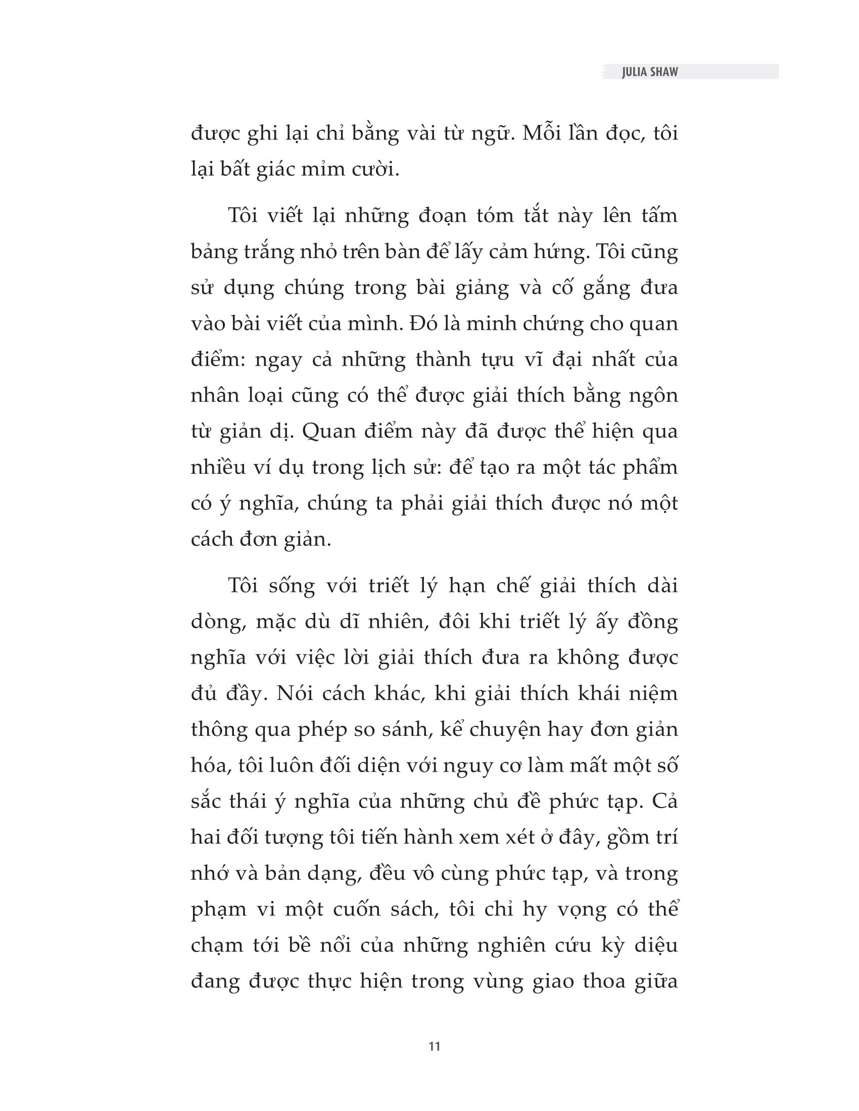 - Bạn nghĩ rằng mọi ký ức của m.ình đều hoàn toàn chính xác? Những lỗi trong quá trình ghi nhớ của chúng ta diễn ra rất phổ biến. Mọi người thường nghĩ rằng bộ não của chúng ta ghi nhớ như một thứ giống như một máy ghi hình - ghi lại và lưu trữ mọi thứ xảy ra với độ chính xác tuyệt đối . Trong thực tế, rất dễ mắc các lỗi trong việc ghi nhớ. Nhiều người có thể vô cùng tự tin rằng trí nhớ của họ chính xác, nhưng thực tế đáng buồn là, trí nhớ không phải bản ghi chép quá khứ chính xác và hoàn hảo như chúng ta vẫn tưởng. Ký ức liên tục biến mất. Ta bước vào phòng và ngay lập tức quên mất m.ình vào đây để làm gì, hoặc ta đột nhiên không thể nhớ ra tên của một người mà m.ình đã gặp nhiều lần trước đó. Vậy hãy thử tưởng tượng, những hậu quả nghiêm trọng nào có thể bị kéo theo, nếu như bộ nhớ đầy thiếu sót của ta không những quên, mà còn có nguy cơ bóp méo thông tin và thêu dệt nên một ký ức hoàn toàn mới - ngay cả khi chuyện đó chưa từng xảy ra? Hội chứng ký ức giả là cuốn sách tổng hợp những nghiên cứu mới nhất về não bộ và trí nhớ: cơ chế ghi nhớ của não bộ, các yếu tố hình thành nên những ký ức không có thật và một số nguyên tắc để cải thiện trí nhớ. Trong cuốn Hội chứng ký ức giả, nhà tâm lý học pháp y, đồng thời là chuyên gia về trí nhớ, Tiến sĩ Julia Shaw đ.ã sử dụng những nghiên cứu mới nhất cho thấy cách bộ não của chúng ta bóp méo ký ức đúng đắn và tạo ra những ký ức về sự kiện không có thực. Cuốn sách đưa ra các dẫn chứng cho người đọc hiểu rằng, ký ức giả không chỉ ảnh hưởng tới chính bản thân người sở hữu ký ức đó, mà còn ảnh hưởng tới xã hội như thế nào: Ký ức giả có thể khiến chúng ta tự tin thái quá vào khả năng ghi nhớ của chính m.ình, khiến cảnh sát bỏ tù không ít người vô tội, thậm chí có thể khiến một người nổi tiếng tiêu tan sự nghiệ Không chỉ có vậy, cuốn sách còn tiết lộ cách để cải thiện trí nhớ thông qua việc thừa nhận ký ức có nguy cơ bị sai sót. Từ đó, người đọc không chỉ sở hữu những kiến thức về khoa học trí nhớ, mà còn biết thêm nhiều phương pháp giúp tăng cường khả năng lưu giữ thông tin chính xác và hiệu quả. Lôi cuốn và đầy bất ngờ, Hội chứng ký ức giả chính là một người bạn đồng hành trên con đường khám phá bản thân chúng ta dựa trên cơ sở khoa học về trí nhớ. Cuốn sách này sẽ giúp chúng ta hiểu hơn về cách ghi nhớ của não bộ, về tính đúng đắn của những ký ức mà ta sở hữu, khiến bạn phải đặt câu hỏi rằng bạn thực sự hiểu bản thân m.ình đến mức nào. Về tác giả Tiến sĩ Julia Shaw là một giảng viên và nhà nghiên cứu kỳ cựu của Trường Luật và Khoa học Xã hội, Đại học London South Bank, đồng thời là một trong số ít chuyên gia trên thế giới thực hiện nghiên cứu về những sai sót trí nhớ phức tạp liên quan đến các sự kiện cảm xúc cá nhân - hay còn gọi là những “ký ức sống động nhưng hoàn toàn không có thật”. Tiến sĩ Shaw xuất bản nhiều bài viết khoa học trên các tạp chí học thuật quốc tế, xây dựng giáo trình, thường xuyên cộng tác với tạp chí khoa học nổi tiếng Scientific American, thỉnh giảng và tham gia thuyết trình tại các hội thảo trên khắp thế giới. Cô cũng giảng dạy các lớp ở bậc đại học và sau đại học, đồng thời đã thắng hai giải thưởng dạy học xuất sắc.