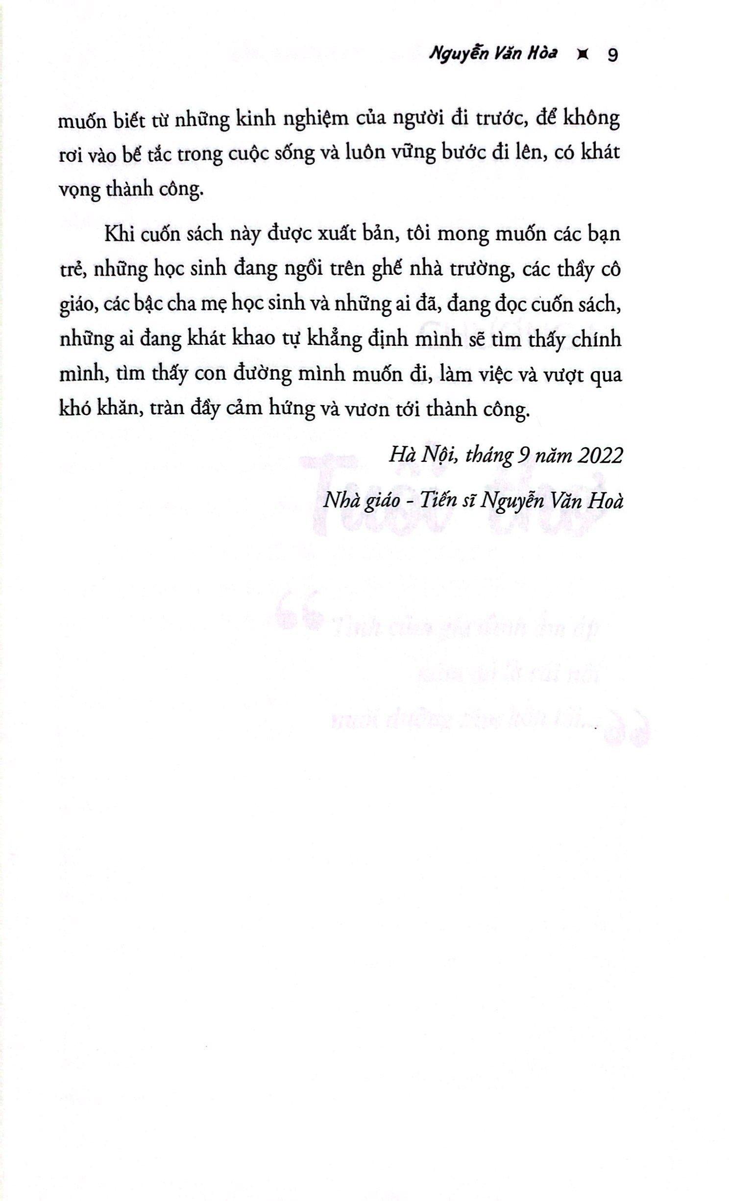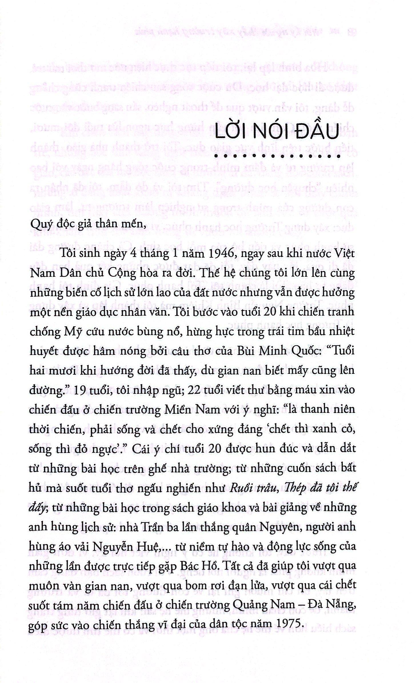 Cuốn sách kể lại cuộc đời với những khó khăn cùng những thành công bằng giọng điệu nhẹ nhàng của một người từng trải. Đau buồn hay giận dữ, hạnh phúc hay hân hoan, tất cả các cảm xúc không còn quá mãnh liệt, nhường chỗ cho những bài học mà thầy đã đúc rút được trong cuộc đời, trong quá trình lập nghiệp, xây nên ước mơ. Và tận đến lúc này, khi đã gần 80 tuổi, thầy vẫn không nghĩ m.ình đã già và cần nghỉ ngơi, được làm việc, được cống hiến là niềm hạnh phúc mà thầy vẫn mong mỏi được tận hưởng từng ngày.