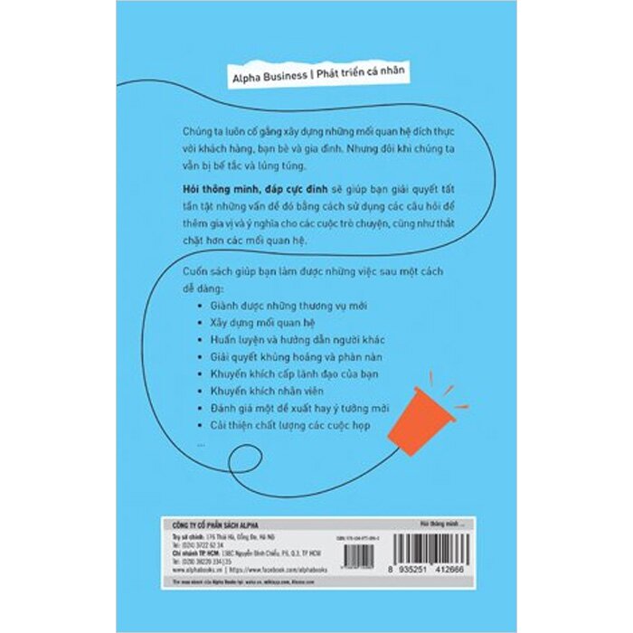 Mua tại TiktokHỏi Thông Minh, Đáp Cực Đỉnh Chúng ta đều cố gắng xây dựng những mối quan hệ đích thực với khách hàng, bạn bè và gia đình. Nhưng đôi khi chúng ta vẫn bị bế tắc và lúng túng. Hỏi thông minh, đáp cực đỉnh sẽ giúp bạn giải quyết tất tật những vấn đề đó bằng cách sử dụng các câu hỏi để thêm gia vị và ý nghĩa cho các cuộc trò chuyện, cũng như thắt chặt hơn các mối quan hệ. Giúp bạn làm được những việc sau một cách thật dễ dàng: