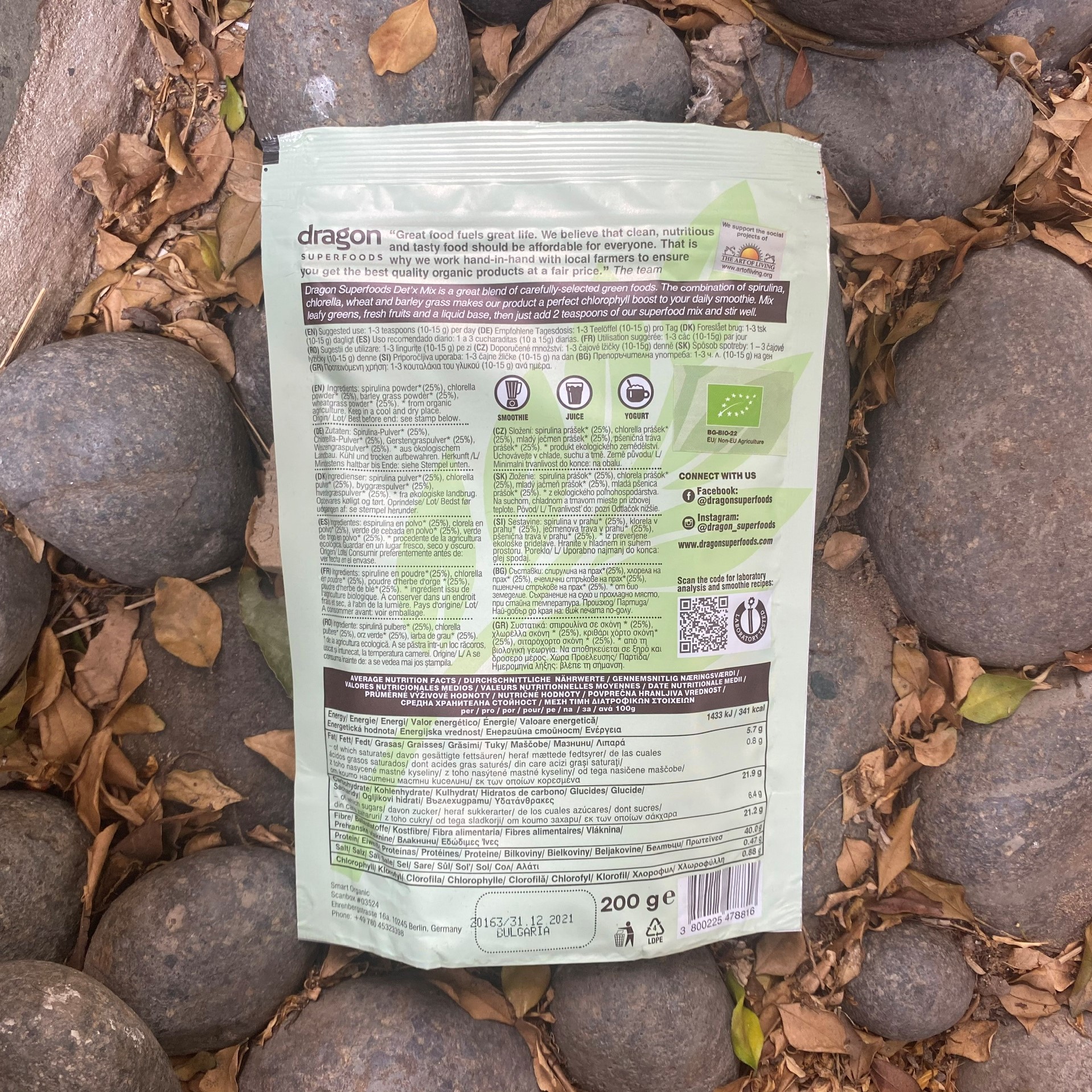 Mua tại TiktokHỗn hợp xanh Det’x của Dragon Superfoods là hỗn hợp tuyệt vời được lựa chọn từ các loại thực phẩm xanh hữu cơ một cách cẩn thận. Sự kết hợp giữa tảo xoắn, tảo lục, cỏ lúa mỳ và cỏ lúa mạch tạo nên một sản phẩm hoàn hảo cho món sinh tố hàng ngày của bạn. Trộn rau xanh, hoa quả tươi và đồ uống cơ bản, sau đó thêm 2 thìa hỗn hợp siêu thực phẩm của chúng tôi và đảo đều. GIÁ TRỊ DINH DƯỠNG TRUNG BÌNH Trên 100g Năng lượng (kJ/kcal): 320Kcal/ 1338kJ Chất béo (g): 5g Trong đó chất béo bão hòa (g): 0,6g Carbonhydrate (g): 12 Trong đó đường (g): 3 Protein (g): 41 Chất xơ (g): 32 Muối (mg): 0,4