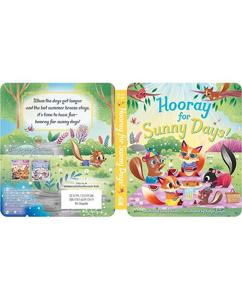 Hooray for Sunny Days Celebrate bright sunny days with this delightful rhyming board book that’s the perfect follow up to Here Comes Fall! and Hooray for Snowy Days! Hooray for splashing in the lake, And for picnics in