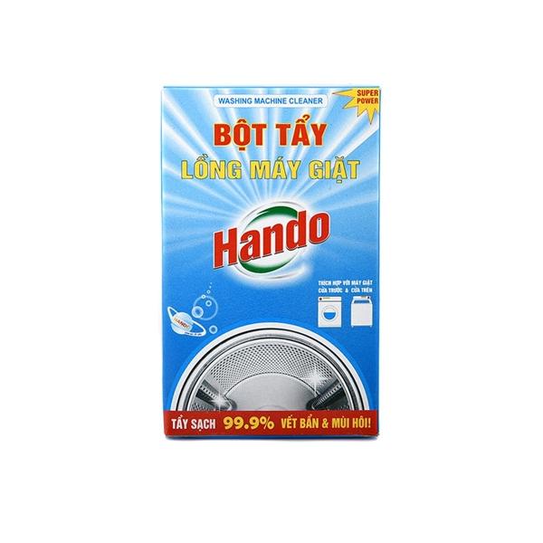 Thông tin sản phẩmTên sản phẩm : Tẩy lồng máy giặt HandoHướng dẫn sử dụng    : Cho 2 đến 3 gói nhỏ bột vào lượng nước khoảng 1/6 thùng giặt, sau đó ngâm 4 đến 10 tiếng và xả hết nước đi.Thành phần : NaOH - H202, phụ gia, chất hoạt động bề mặtCông dụng : Làm sạch lồng giặtHướng dẫn bảo quản : Bảo quản nơi thoáng mát, tránh tầm tay trẻ nhỏQuy cách : HộpKhối lượng tịnh : 200gkích thước hộp : 13,5x8,5x3,5Xuất xứ : Việt Nam Máy giặt sau một thời gian sử dụng lồng giặt sẽ bị cặn canxi và hóa chất từ bột giặt bám vào làm mất độ sạch bóng, các khe, góc trong lồng giặt cũng bị chất bẩn bám vào làm ố màu rất mất thẩm mỹ và ảnh hưởng đến chất lượng quần áo sau khi giặt. Những vết ố làm mất thẩm mỹ của máy và nếu để lâu không được vệ sinh máy của bạn sẽ không thể tỏa nhiệt, rất dễ dấn đến hỏng máy. Lượt deal lần này, chúng tôi sẽ mang đến giải pháp cho máy giặt nhà bạn để luôn sạch bóng với Bột tẩy vệ sinh lồng máy giặt Hando. Click Mua Ngay để giúp tẩy sạch lồng máy giặt như mới một cách nhẹ nhàng nhé!