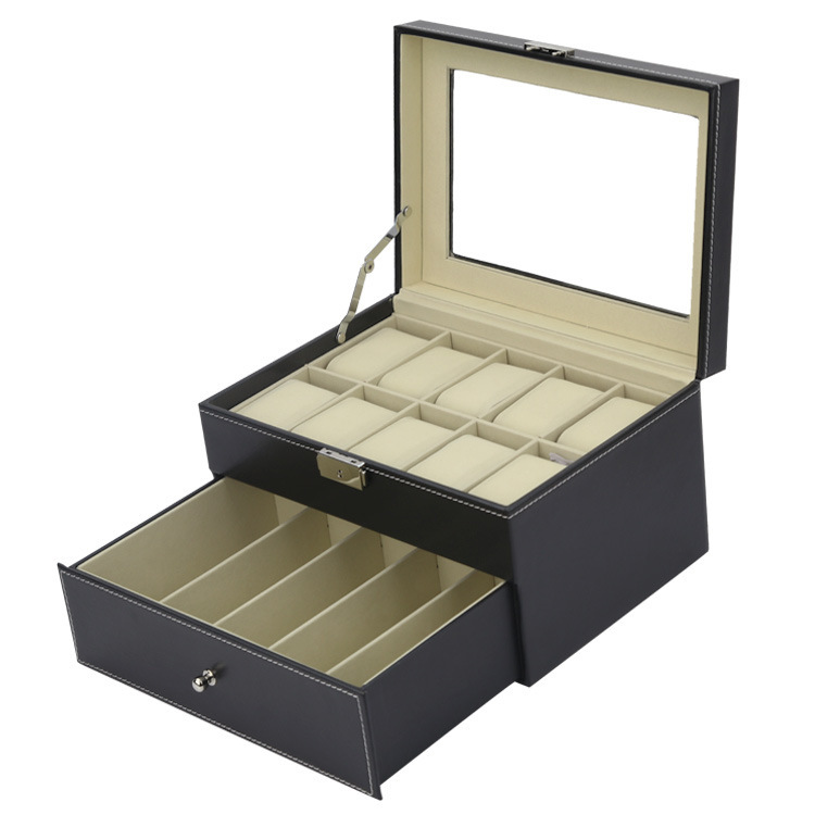 - Hộp thiết kế 2 tầng: tầng trên đựng 10 chiếc đồng hồ, tầng trên có khóa, tầng dưới đựng 5 mắt kính thiết kế kiểu ngăn kéo