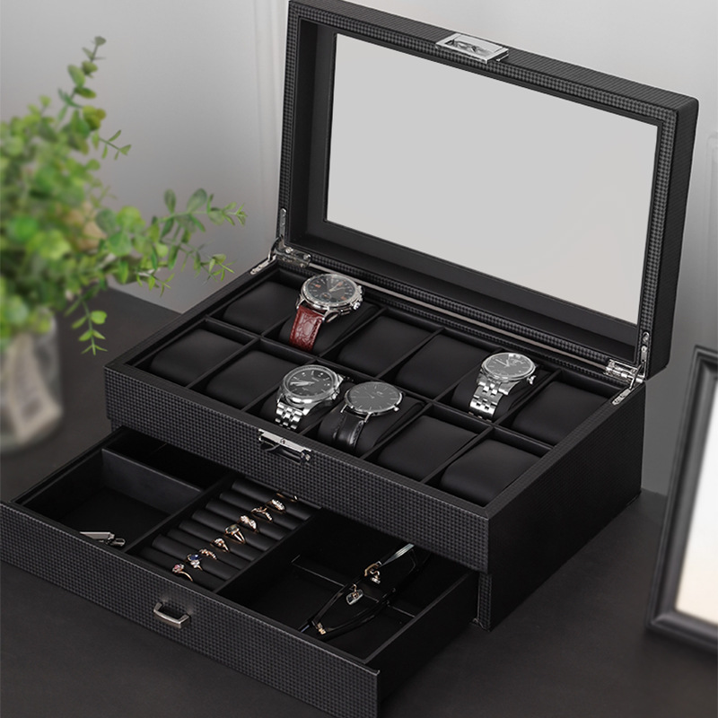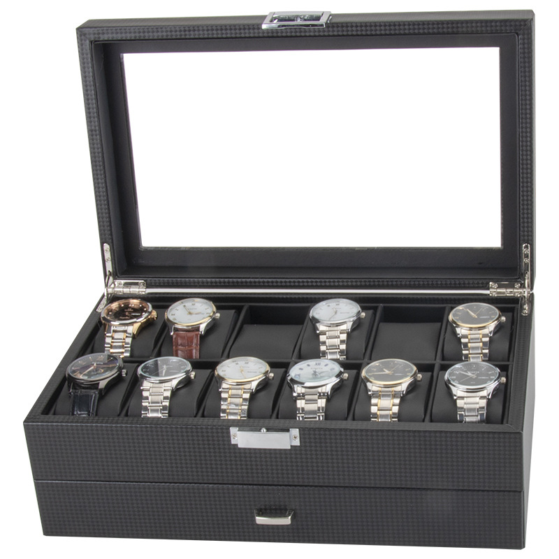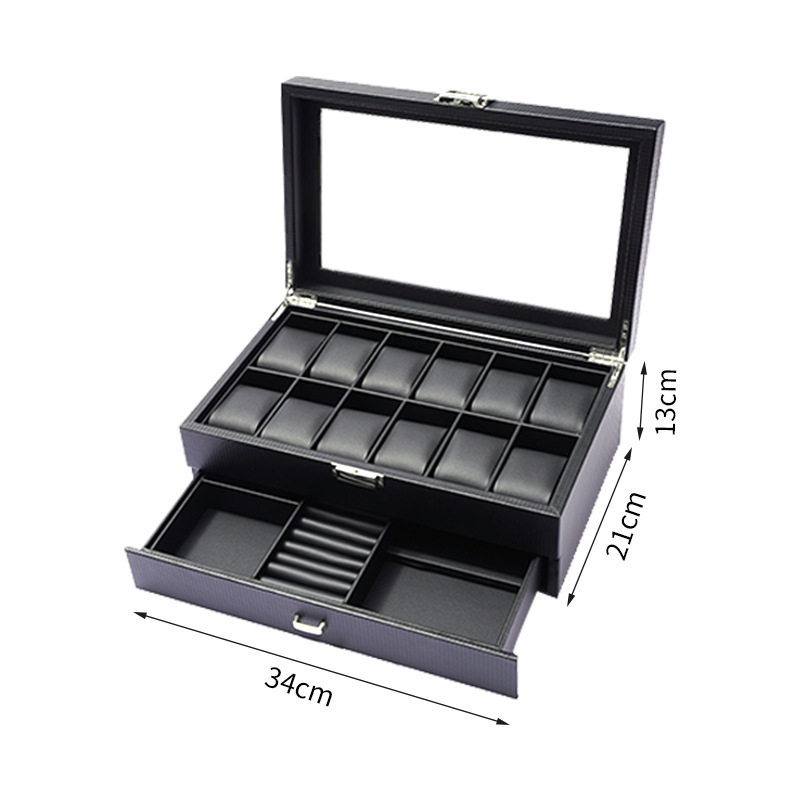 Hộp Đựng 6 Đồng Hồ & Trang Sức 2 Tầng Da Vân Carbon Nắp Kính Khóa Kim Loại - D6TC