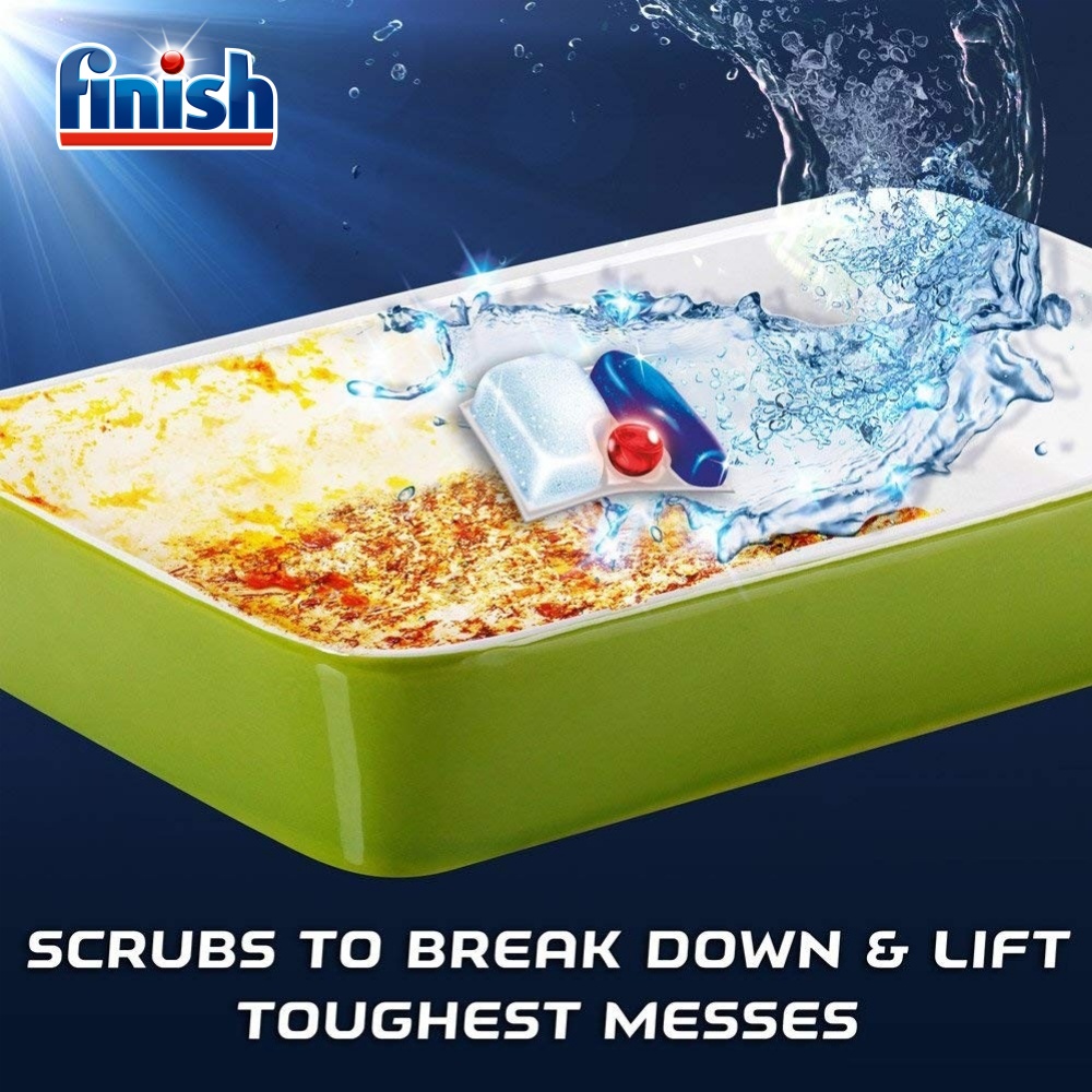 MÔ TẢ SẢN PHẨM: Viên rửa chén Finish dành cho máy rửa chén tự động 10x Sức mạnh làm sạch Bao gồm Chất tẩy rửa và với gấp 5 lần so với dòng Classic Finish