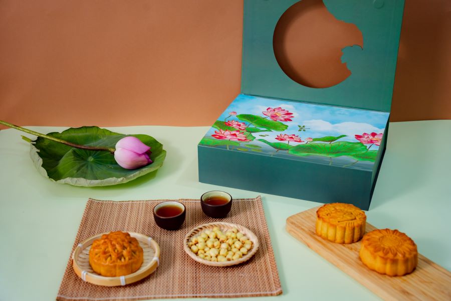 Hộp bánh trung thu 4 bánh chay 220g - Thành Long - Combo chay trăng/ chay 4 880g - Tặng 1 hộp trà - Combo chay trăng: gồm 2 bánh nhân thập cẩm jambon xá