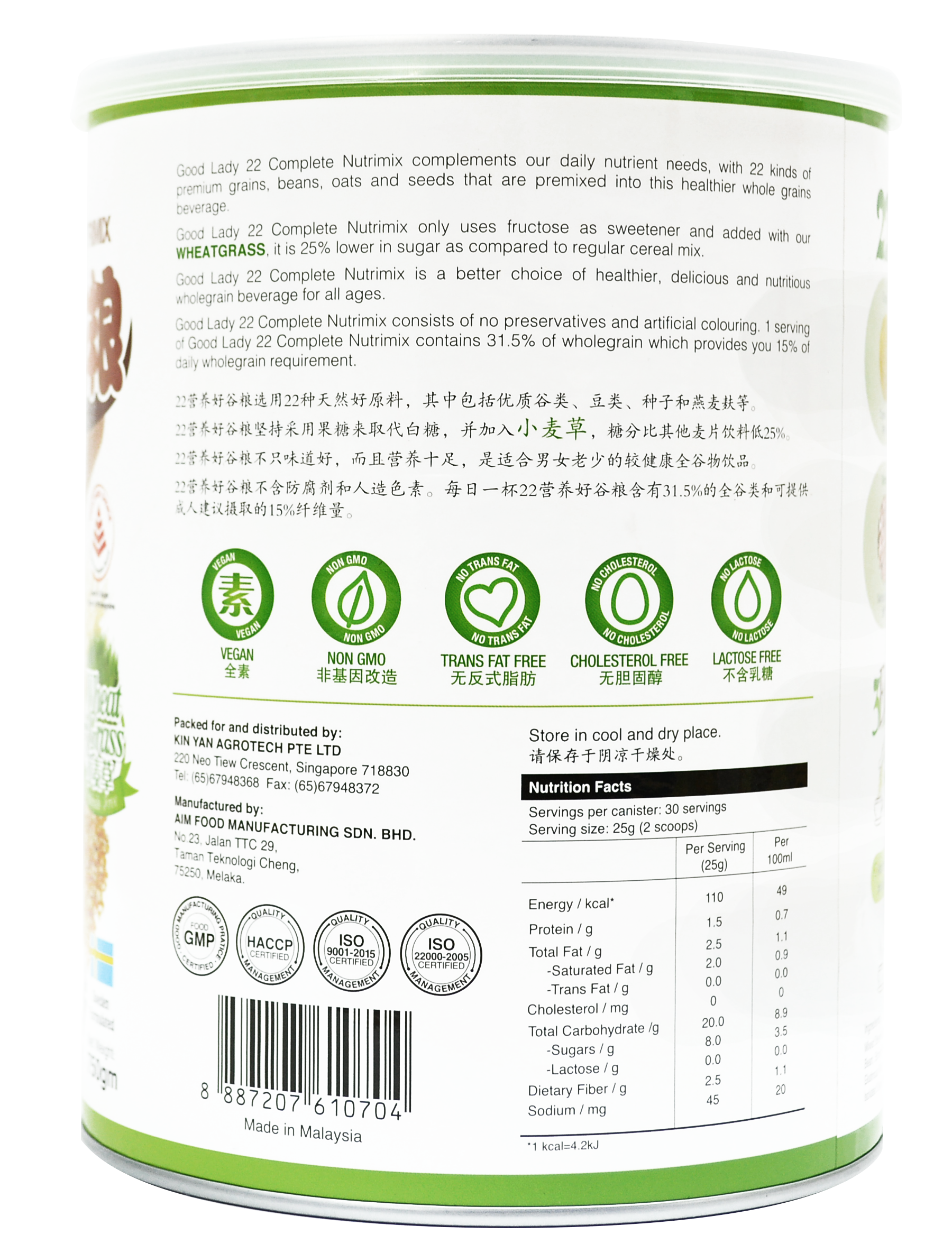 GỒM 22 DƯỠNG CHẤT: Gạo lứt, bắp, đậu nành, gạo đỏ, đậu đỏ, đại mạch, đậu xanh (đậu mung), đậu garbanzo, đậu nâu, hạnh nhân, đậu co ve, hạt sen, đậu đen, lúa mì trắng, hạt kê hữu cơ, mè đen, gạo nếp, hạt lanh hữu cơ, bột yến mạch, mầm lúa mì, vỏ hạt mã đề, lecithin đậu nành.
