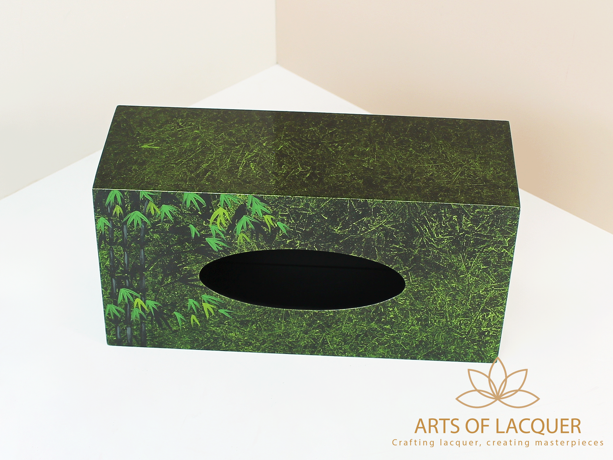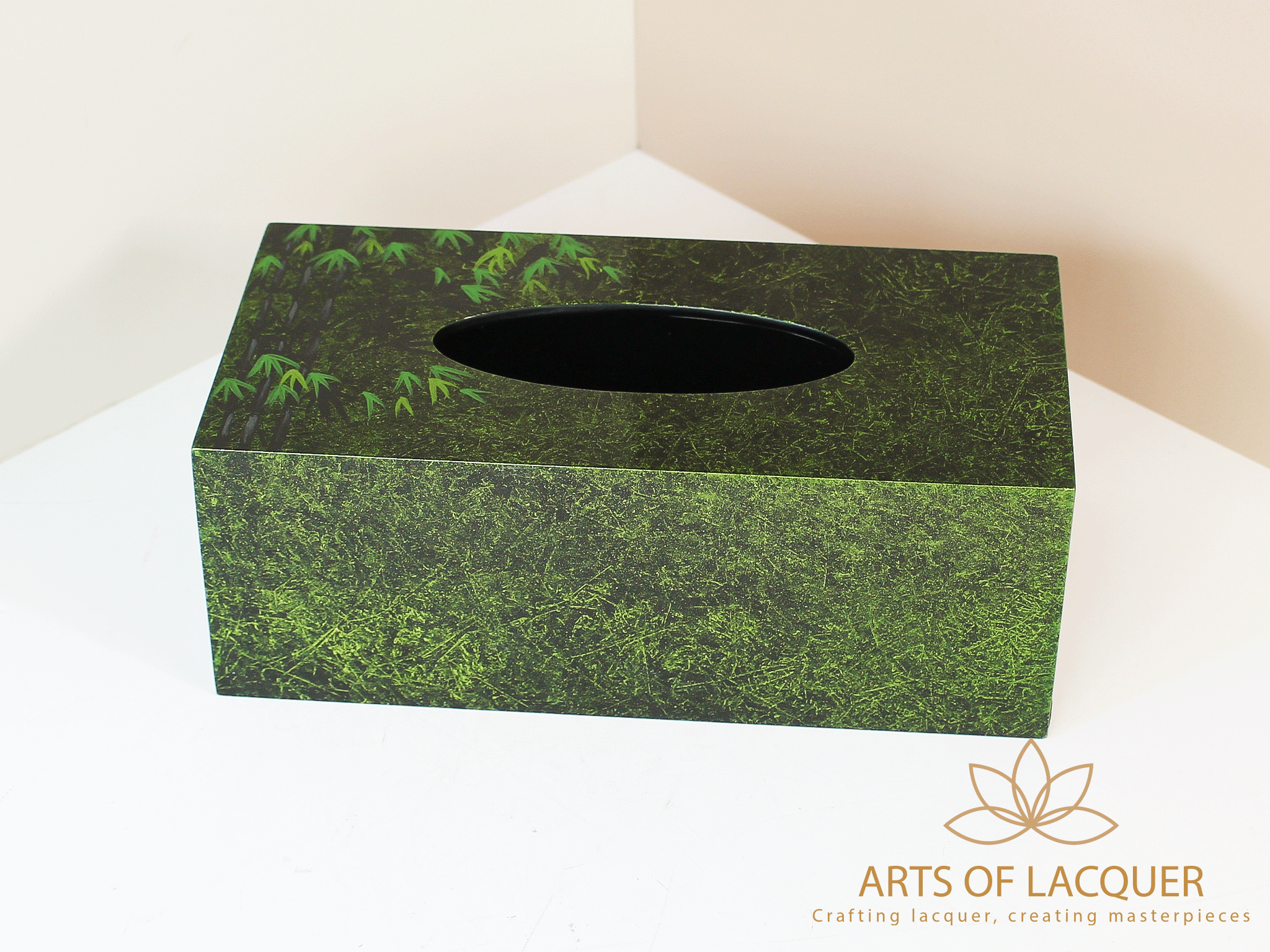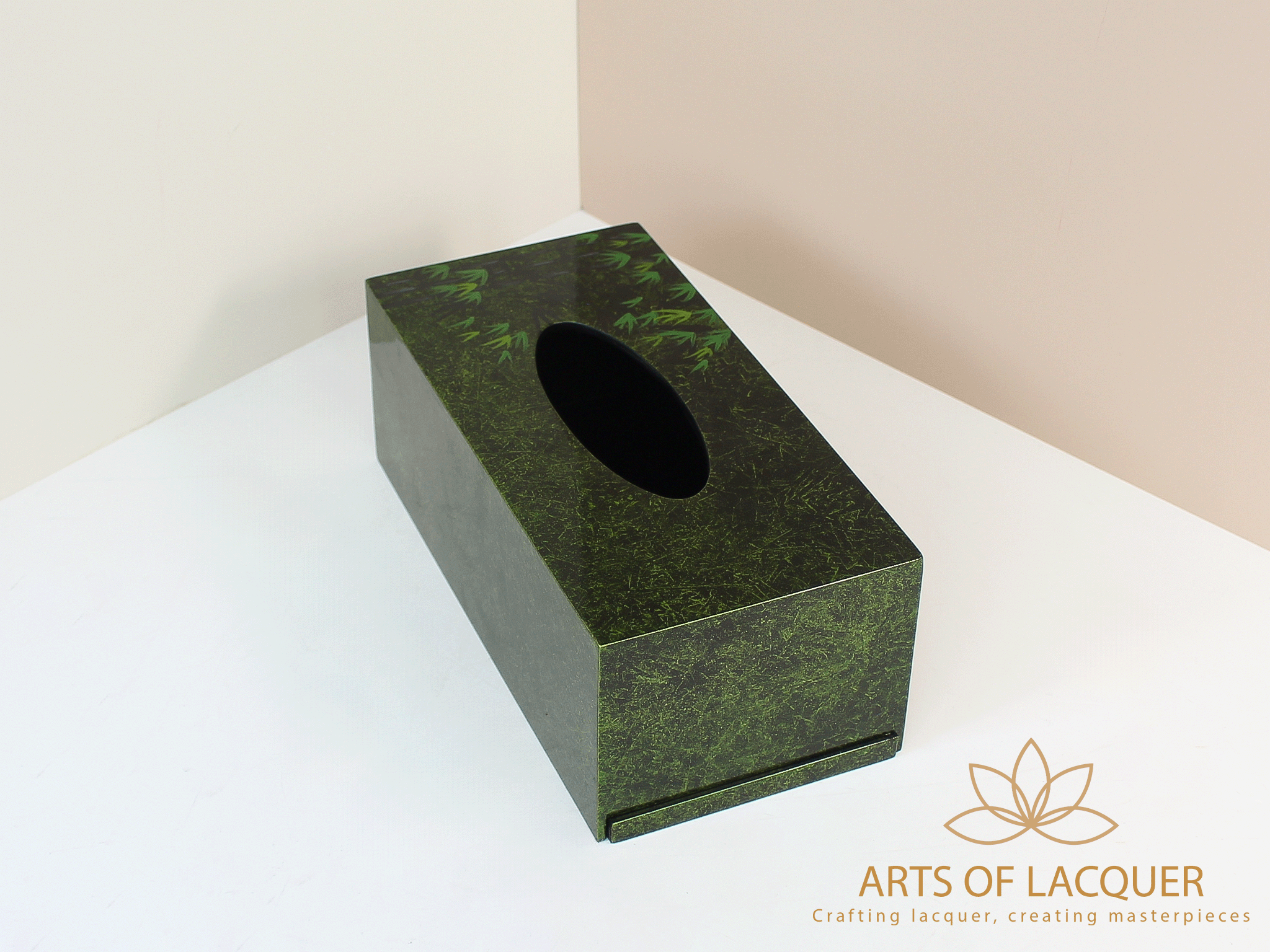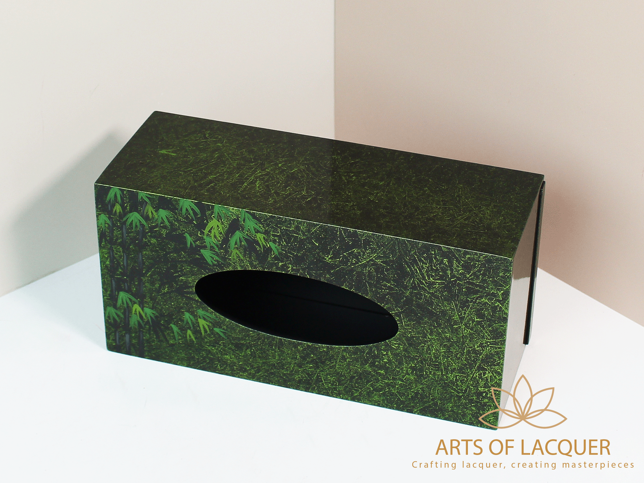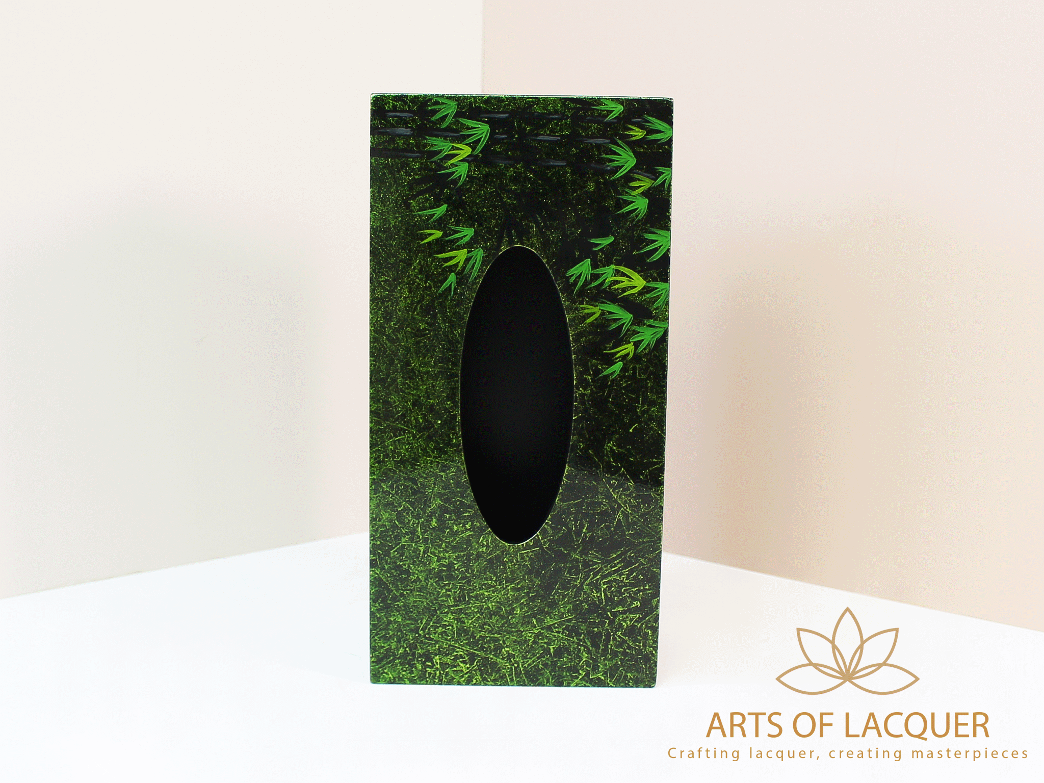 Mua tại TiktokHộp đựng khăn giấy trong hình là "Hộp Đựng Khăn Giấy Sơn Mài Họa Tiết Tre" từ Arts of Lacquer. Hộp có nền xanh lá cây với họa tiết tre tinh tế, mang lại cảm giác tự nhiên và tươi mới. Chất liệu là gỗ sơn mài, đảm bảo độ bền và chống nước.