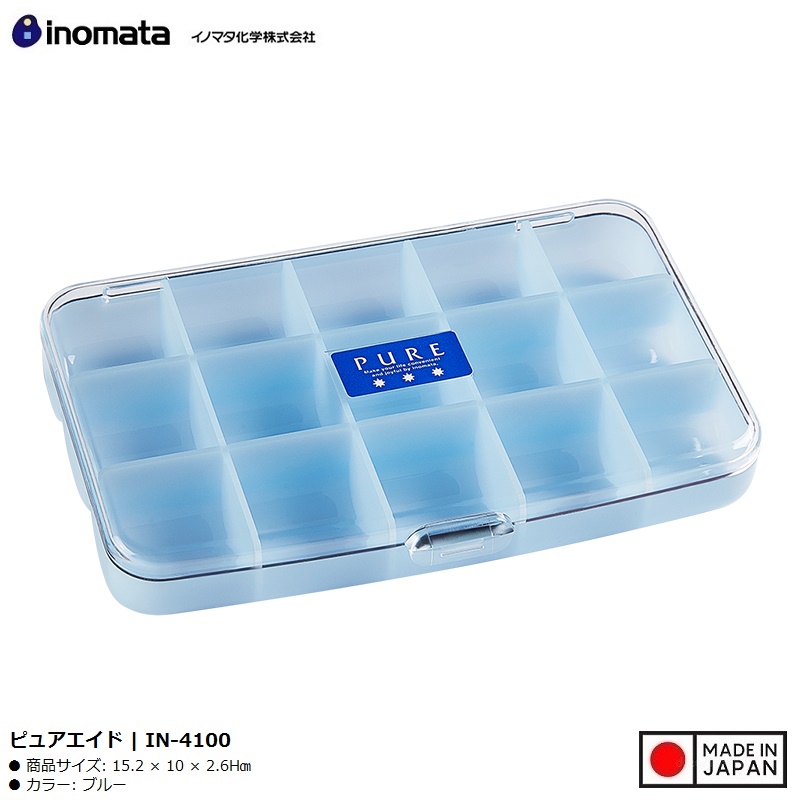 Hộp đựng thuốc chia ngăn Inomata Pure Aid ■ Xuất xứ: Nhật Bản | MADE IN JAPAN ■ NSX: Inomata Kagaku Co., Ltd (Japan) ■ Model: IN-4100 ■ Kích thước: 15,2 × 10 × 2,6Hcm ■ Màu sắc: Màu xanh ■ Chất liệu: