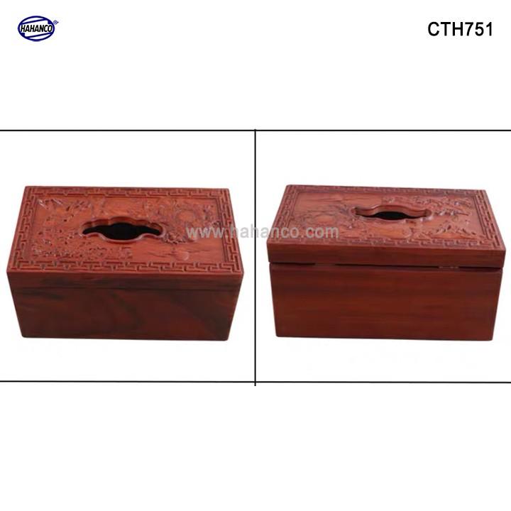 Hộp giấy ăn bằng gỗ hương được chạm khắc tỉ mỉ, phủ PU có độ bền cao.