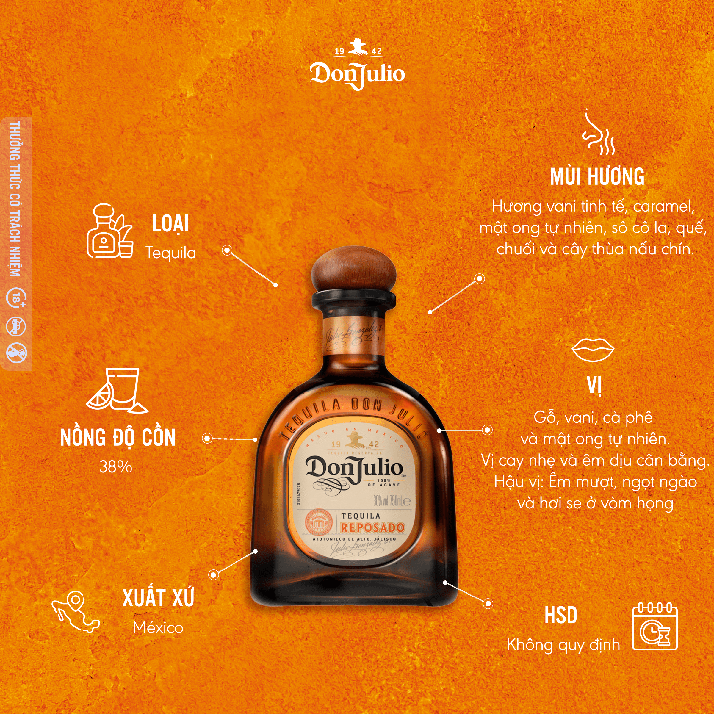 - 1 chai rượu 750ml Rượu Don Julio Reposado Tequila 38% Được ủ trong thùng gỗ sồi trắng Mỹ trong tám tháng, Don Julio Reposado Tequila có màu hổ phách vàng, và mang đến hương vị đậm đà, êm dịu - chính là tinh túy của loại tequila ủ trong thùng gỗ sồi hoàn hảo. Với hương vị êm dịu, thanh lịch và mùi thơm hấp dẫn, Don Julio Reposado Tequila ngon nhất khi thưởng thức như một phần của một loại cocktail có hương vị sảng khoái hoặc ướp lạnh với đá. THÀNH PHẦN - NGUYÊN LIỆU: -Don Julio là một thương hiệu rượu tequila nổi tiếng được chiết xuất 100% từ cây thùa gai được trồng trên vùng cao nguyên ở Jalisco, Mexico. Sản phẩm được sản xuất bằng kỹ thuật truyền thống và hiện đại, đảm bảo chất lượng và hương vị tuyệt vời. Rượu tequila Don Julio là một trong những thương hiệu rượu tequila hàng đầu thế giới. -Ủ 8 tháng Sản phẩm được Tiki đóng gói vô cùng cẩn thận với nhiều lớp chống sốc, đảm bảo an toàn khi vận chuyển. Sản phẩm còn đi kèm túi đựng sang trọng, rất phù hợp để làm quà tặng.